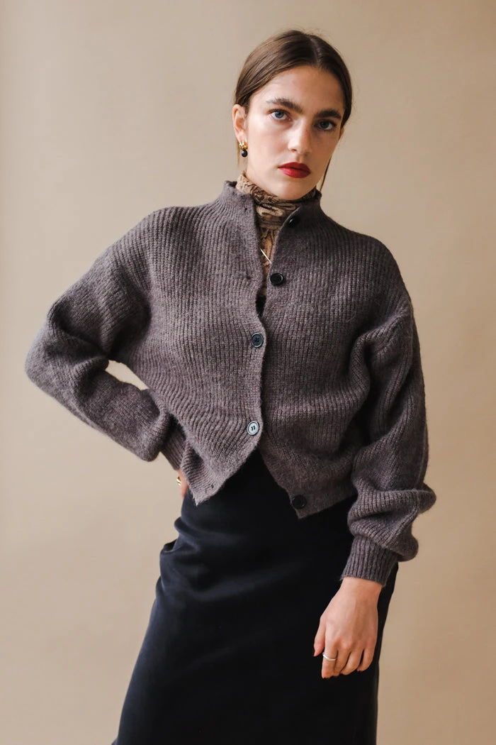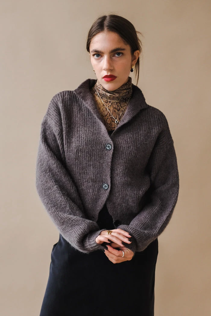 Adeline button up knit cardigan sweater in charcoal grey.Â