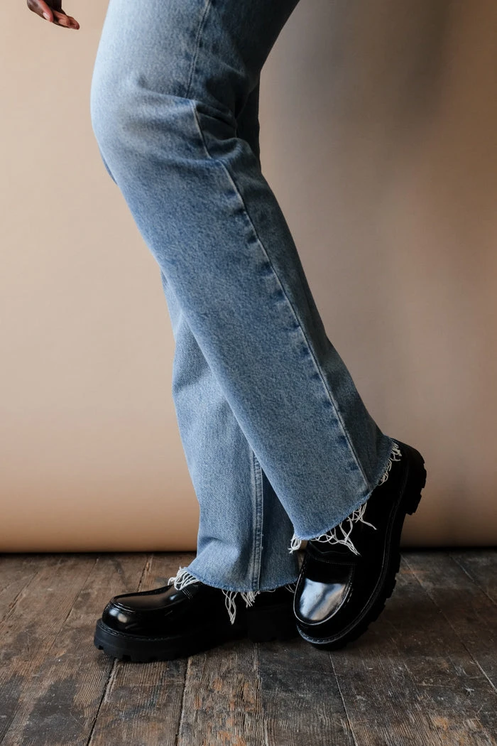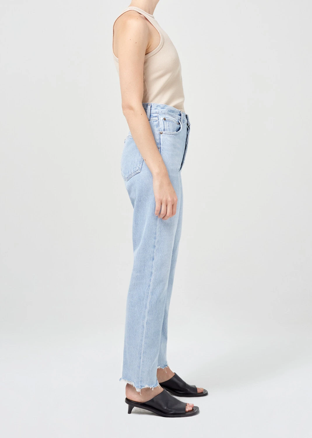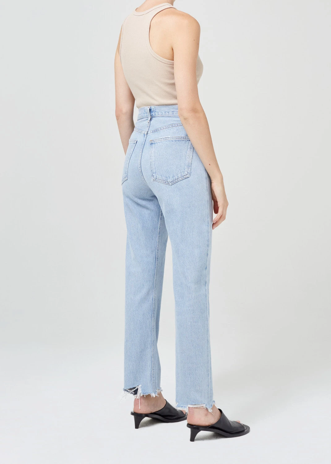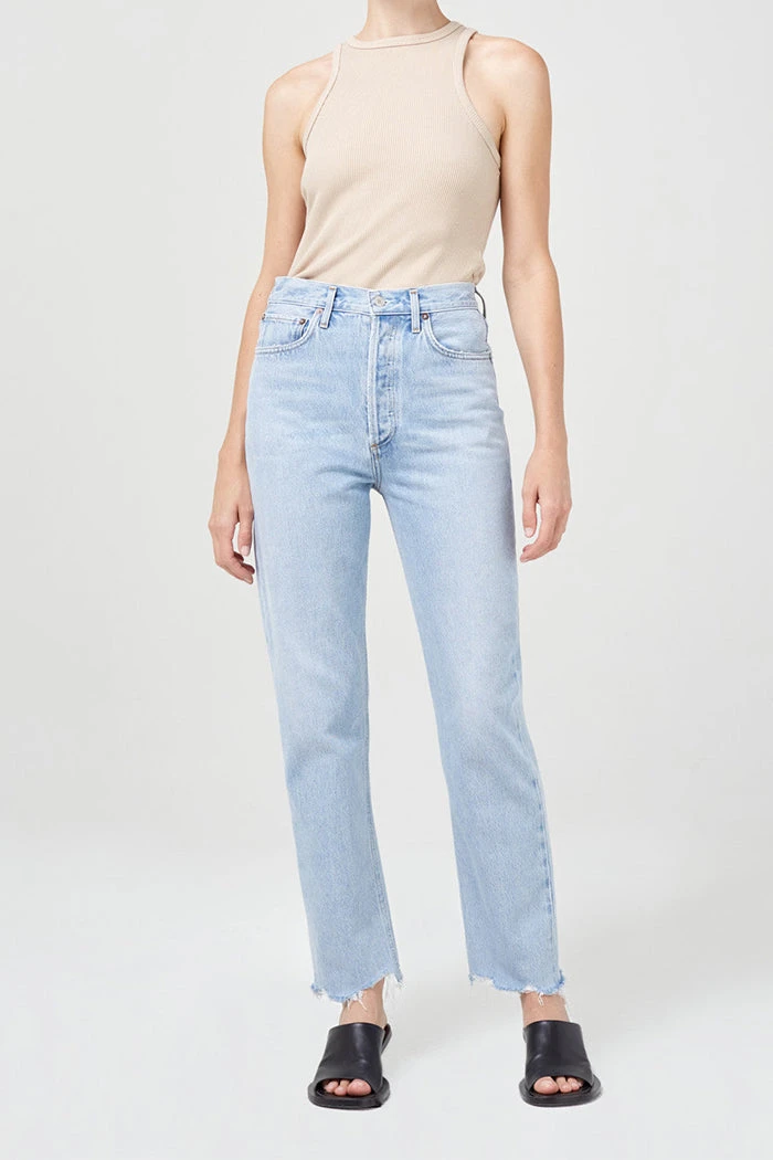 Agolde 90’s pinch waist, high rise in light blue Imitate wash. The 90’s Pinch Waist is a vintage inspired straight. This pair sits neat at the true waist with a close-fitting top block and easy leg. Raw hem and button fly.