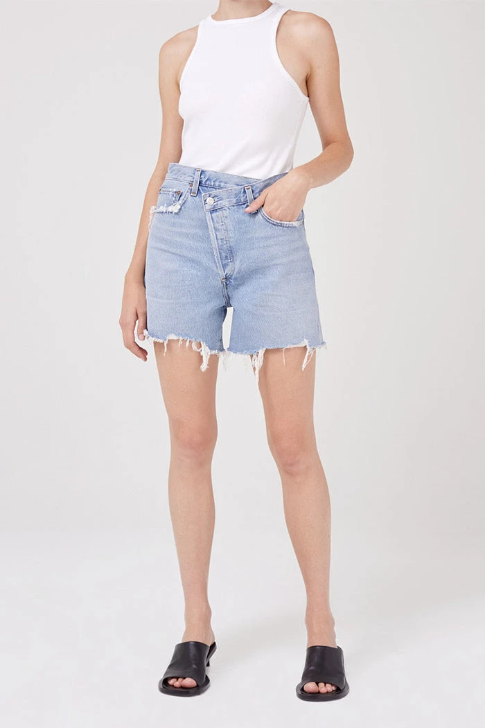 Agolde criss cross boyfriend fit denim shorts, in vintage symbol blue wash. Cut with an easy leg and unfinished hem. Can be styled rolled. Non stretch, button fly closure.Â