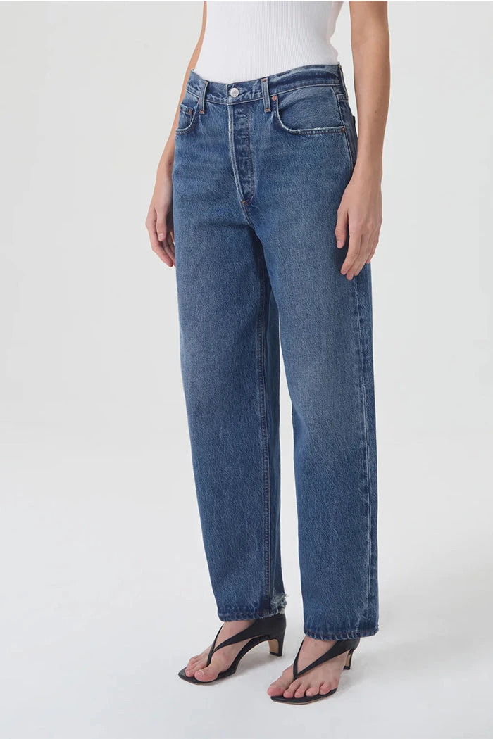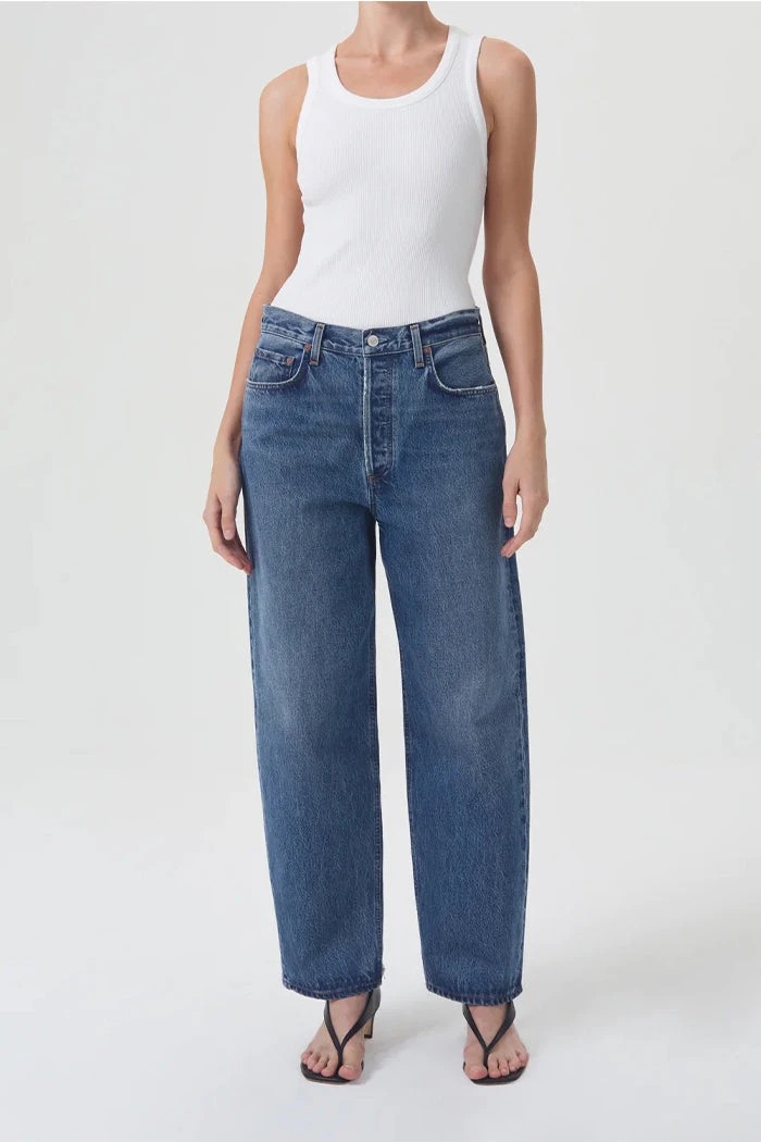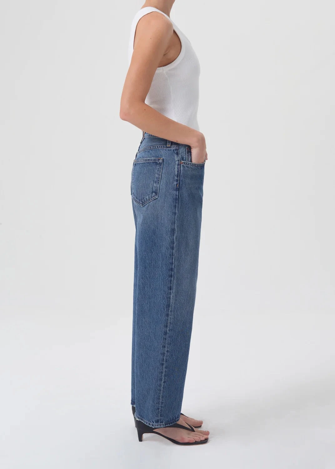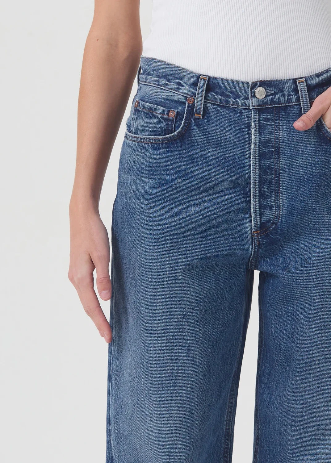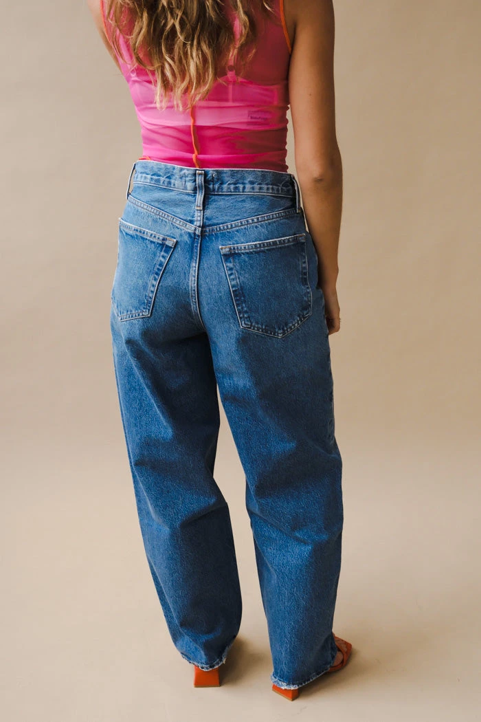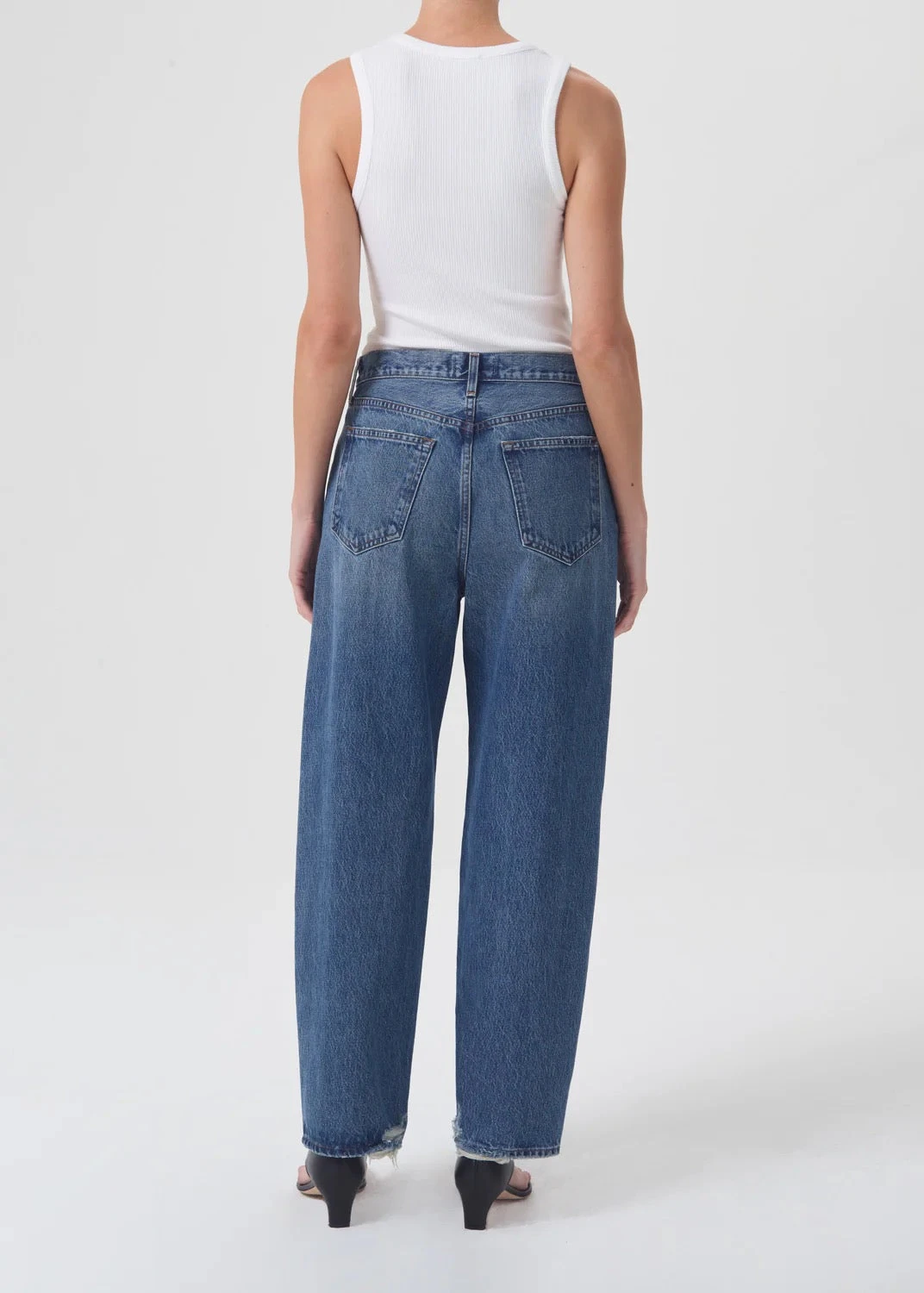 Agolde Dara baggy tapered jean in medium clean blue pattern wash. Roomy though the hip and thigh and finished with soft taper at the ankle. Crafted in a non-stretch organic cotton denim that only gets better with every wear.Â