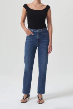 Agolde high rise stovepipe jeans in dark clean indigo blue aspire wash with finished hem. Crafted in signature low stretch denim, this classic high rise straight features a slim leg designed to elongate your frame. Zip fly.