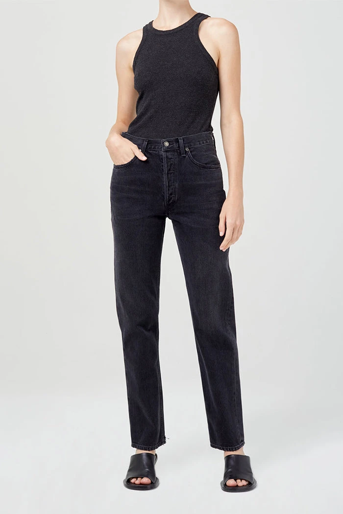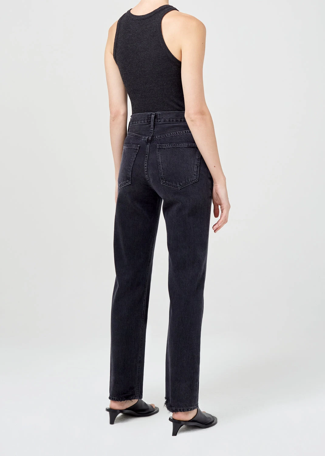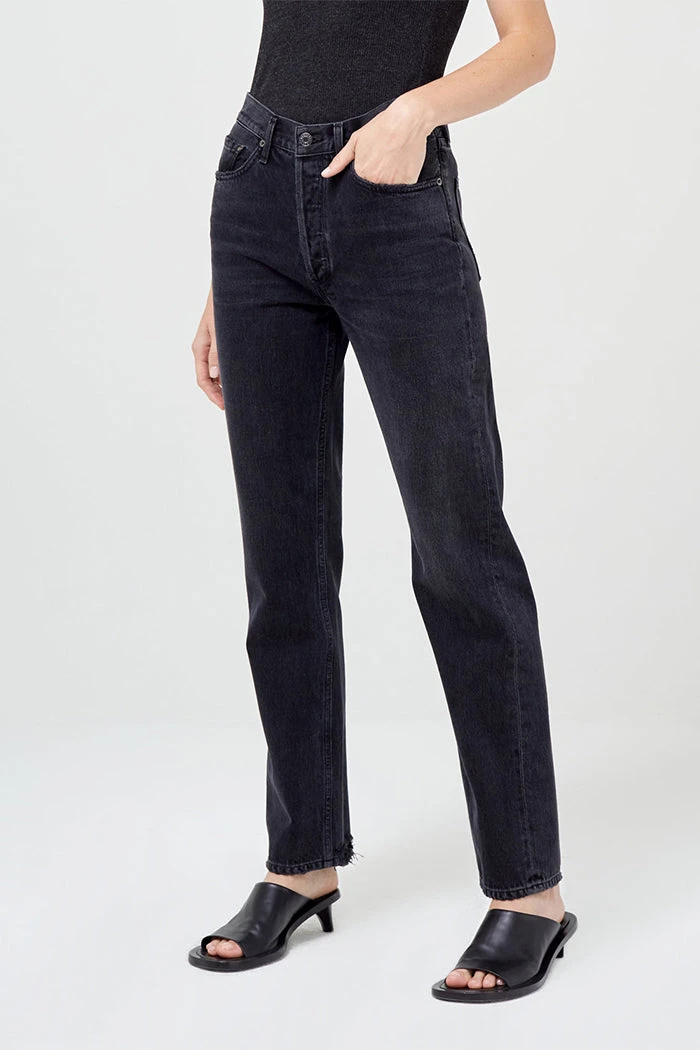 Agolde Lana straight leg jeans in washed black conduct wash. True straight leg silhouette, sits at your waist with a slightly relaxed, full-length inseam. This vintage-inspired fit is crafted with an authentically worn-in feel. Non-stretch, button closure.Â