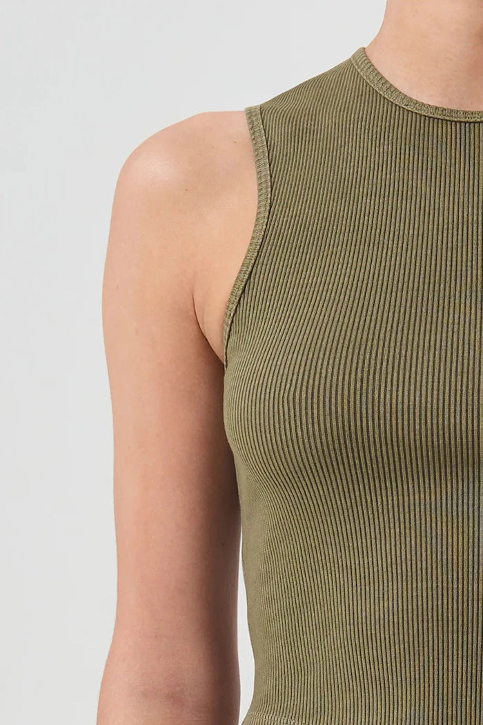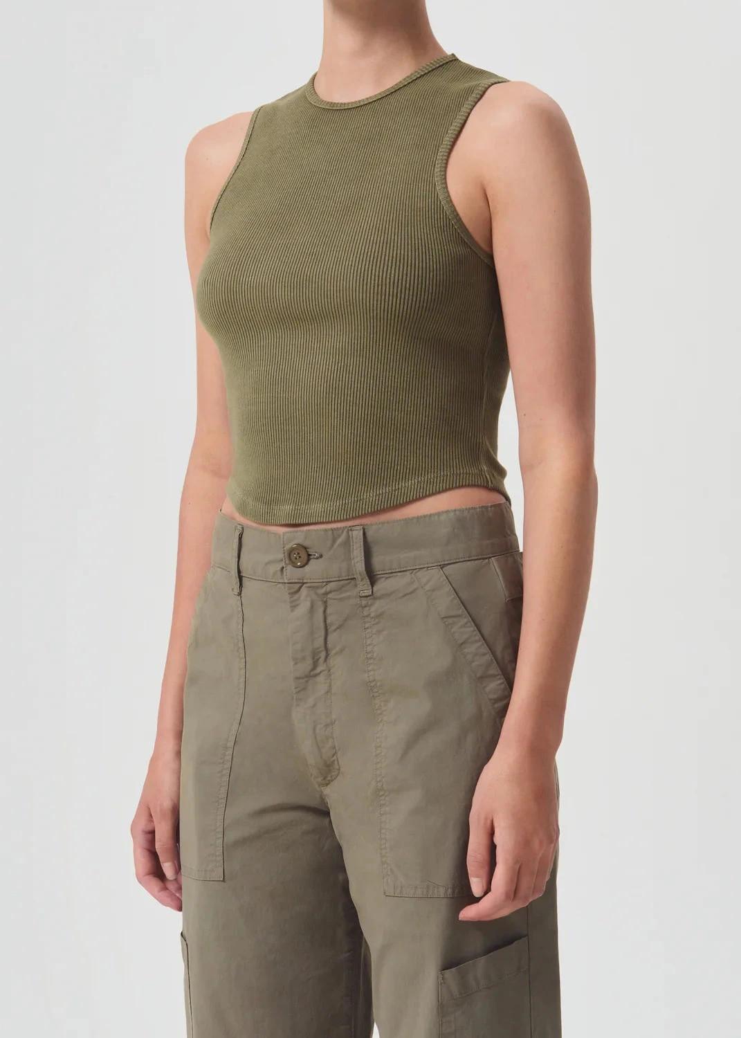 Agolde ribbed cropped Nova tank top in white Crafted from form-fitting, supportive yet breathable rib, perfect as the weather warms. The curved, cropped hem makes this the perfect tank to pair back with low rise denim.