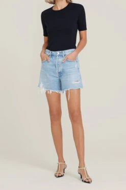 Agolde Parker long jean shorts in swapmeet light indigo wash. Looks like the perfect vintage fit, but tailored to feel as if they were made just for you. With a little added length, the Parker Long is the ultimate classic cut-off. It hugs comfortably at the waist with a roomier fit through the hem and an elongated inseam. You’ll be wearing yours on repeat with a cool tee or a sleek bodysuit. Button fly.