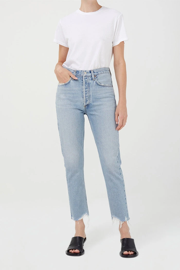 Agolde Riley high rise, straight, crop in light blue curio wash. High rise slim straight, sits close to the body with a cropped inseam, unfinished hem, and subtle fading. Non-stretch. Button fly closure.Â
