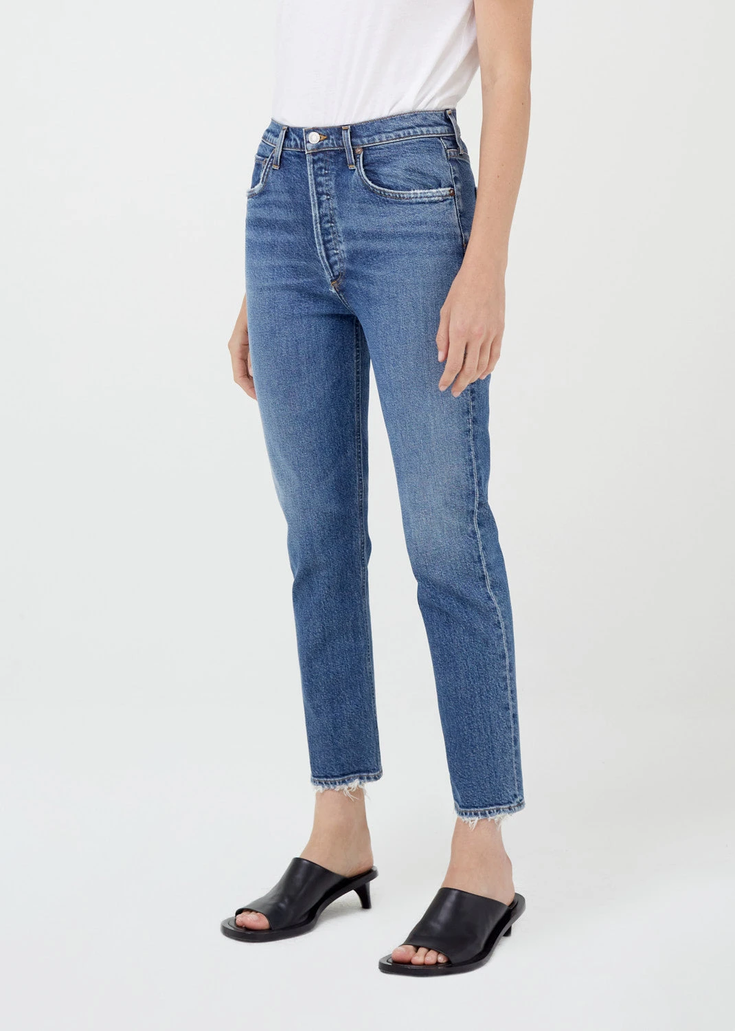 Agolde Riley high rise crop in clean medium blue silence wash. With a better-than-vintage aesthetic, the Riley is an iconic brand favorite. The flattering high-rise and straight leg hold close to the body for a universally loved look. A cropped inseam makes these easy to style with anything from sandals to a heeled boot.Â