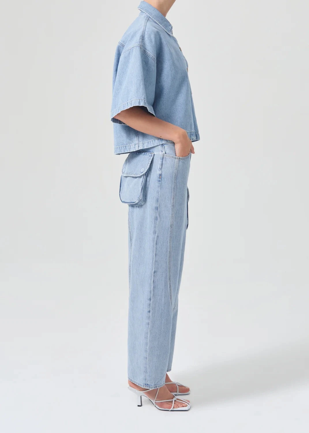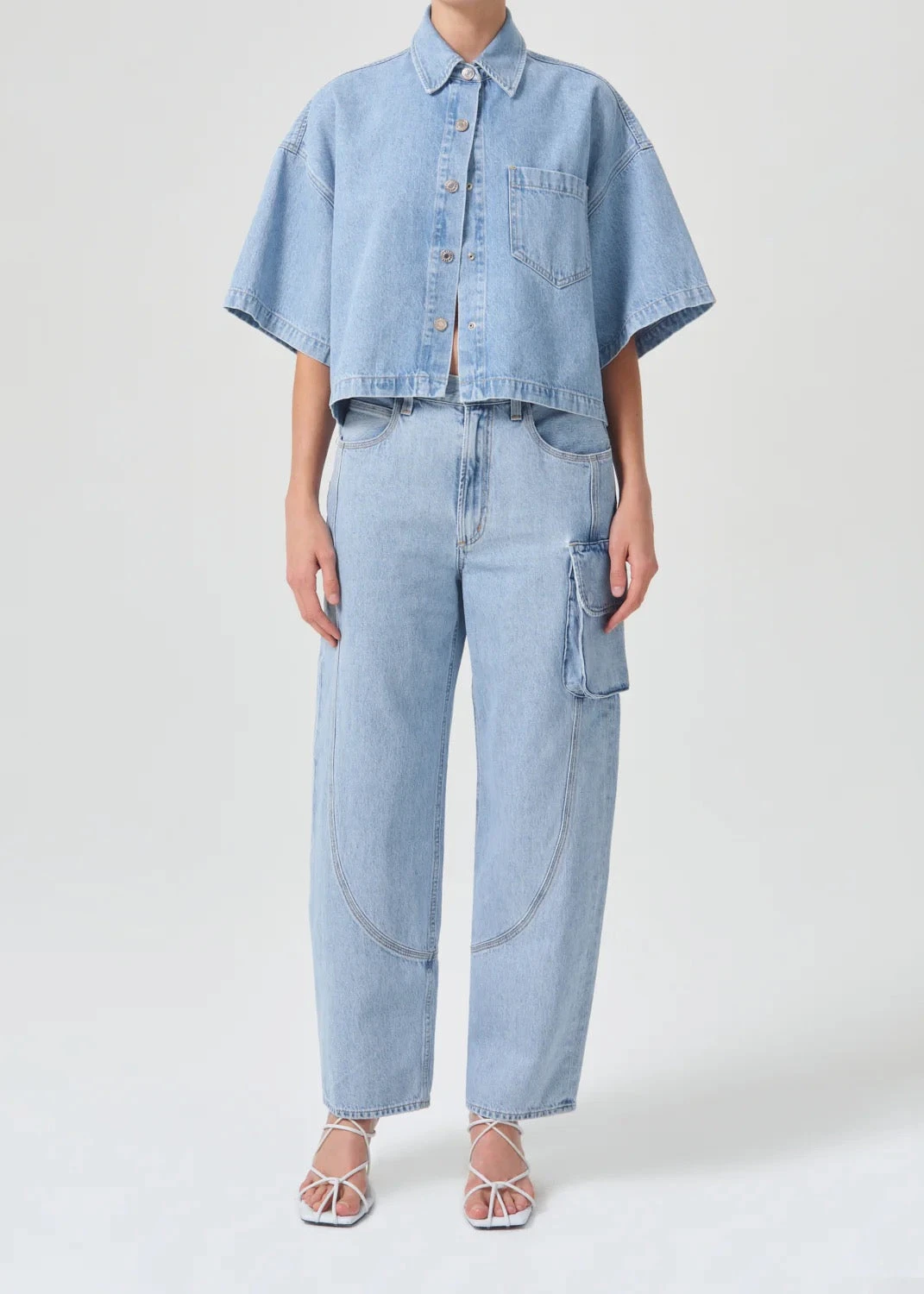Agolde short sleeve Rona denim button up box shirt in tomorrow blue wash. Snap button placket. Designed with an oversized, boxy silhouette, a dropped shoulder into extended short sleeves and with cropped hem.