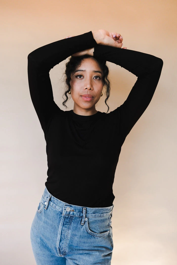 Agolde Shona long sleeve ribbed t-shirt in black. Crafted in a super soft, slightly sheer lightweight rib. With a fitted silhouette, that’s not too tight, makes for an ideal layering wardrobe essential.