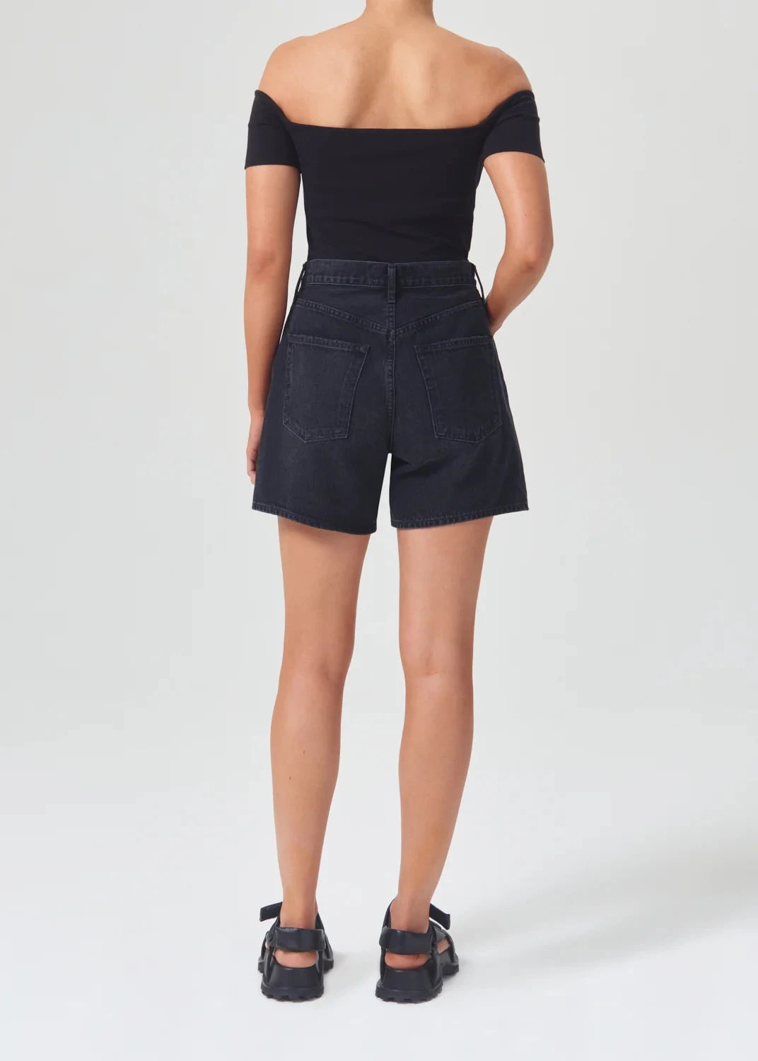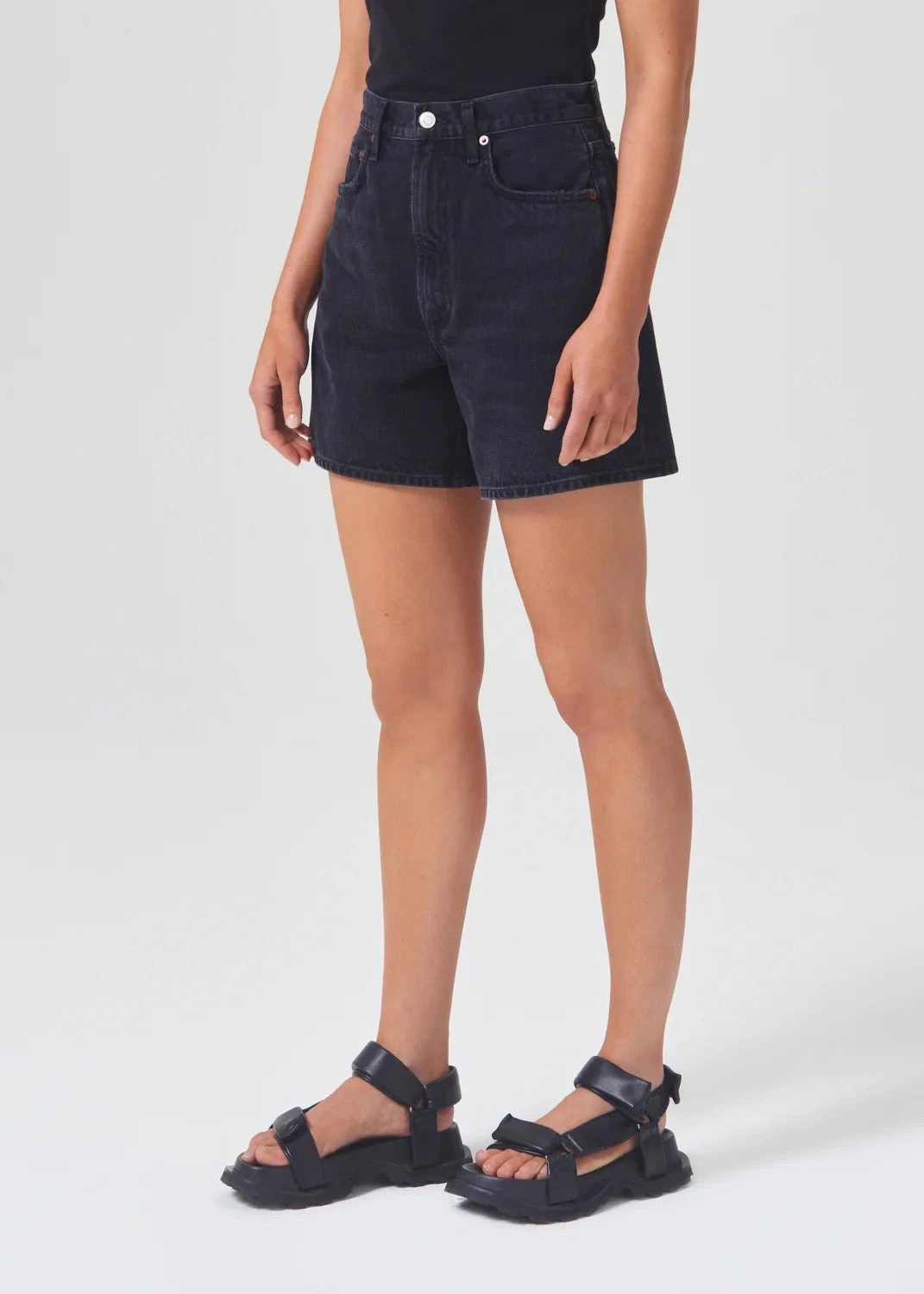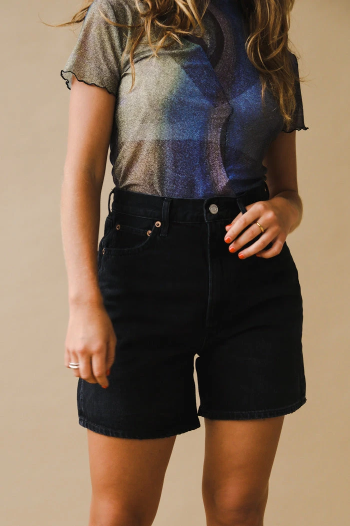 Agolde Stella denim shorts in clean washed black Bat wash, with finished hem. Cut with a cinched, high waist and relaxed silhouette with room through the thigh. Designed with an angled hem for an ultra-flattering fit. Button fly.