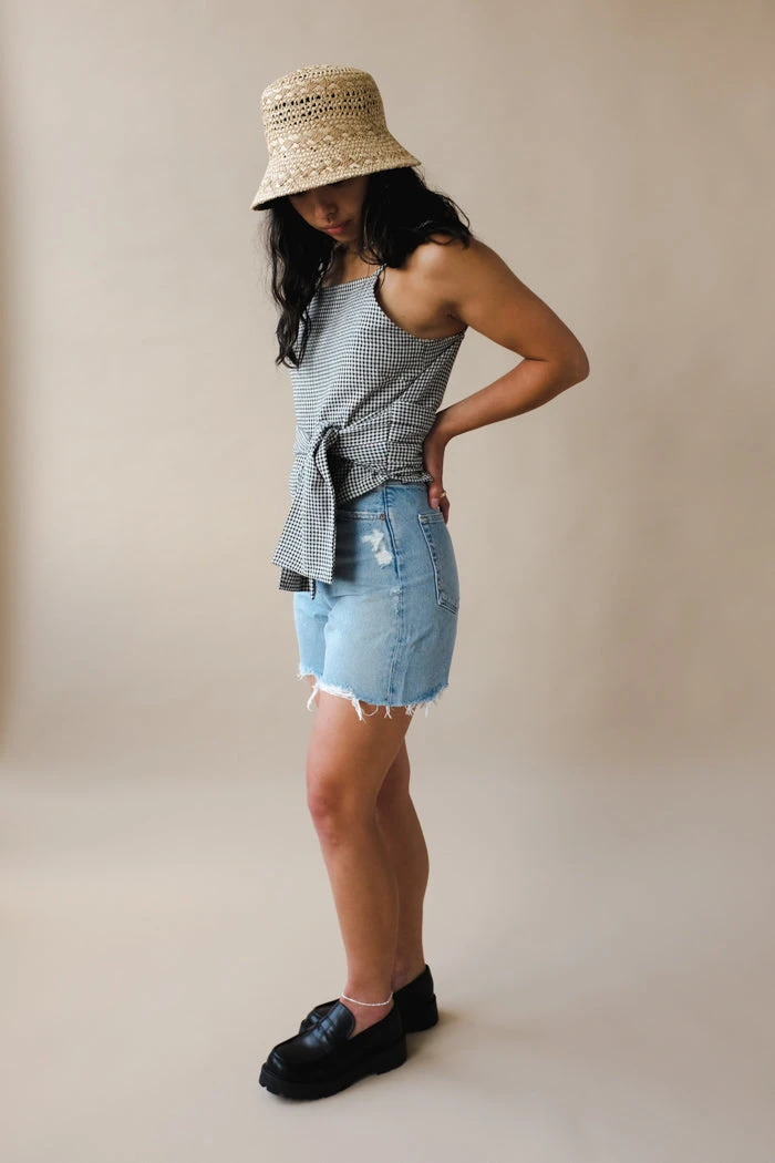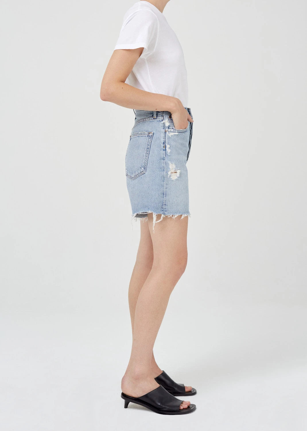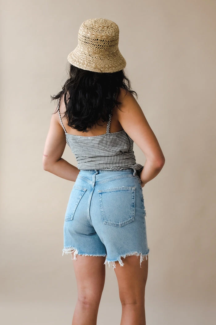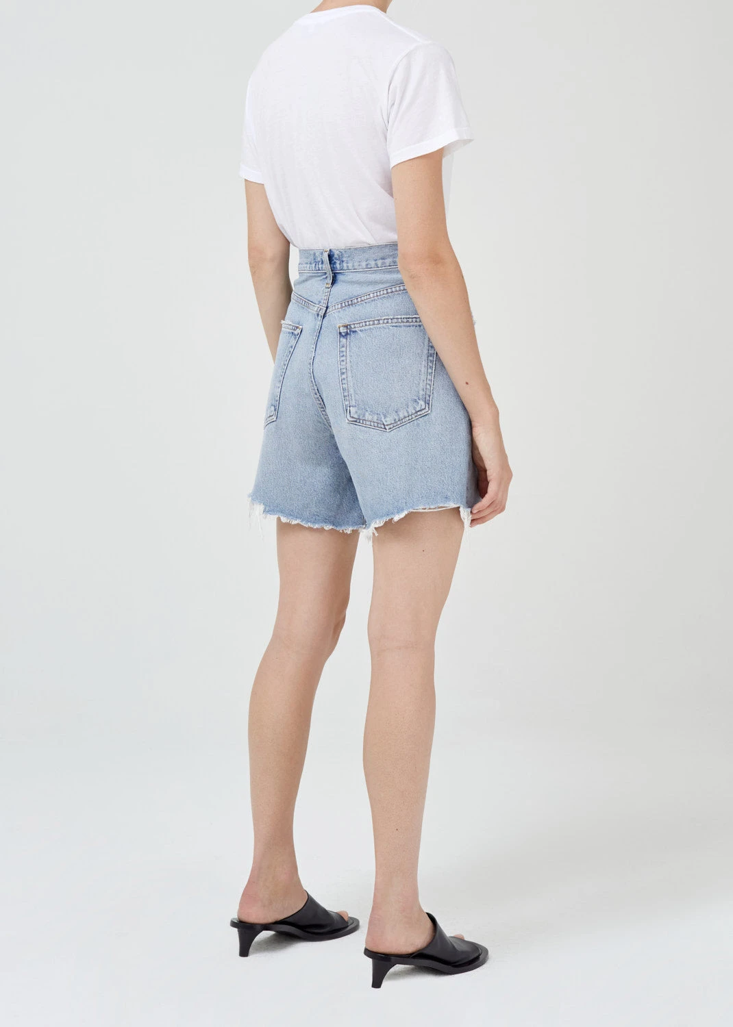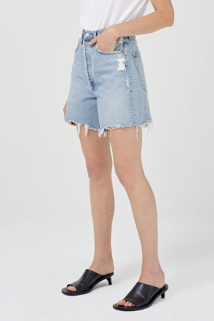 Agolde Stella denim shorts in light blue deserted wash with slight fading and raw hem. Cut with a cinched, high waist and relaxed silhouette with room through the thigh. Designed with an angled hem for an ultra-flattering fit. Button fly.