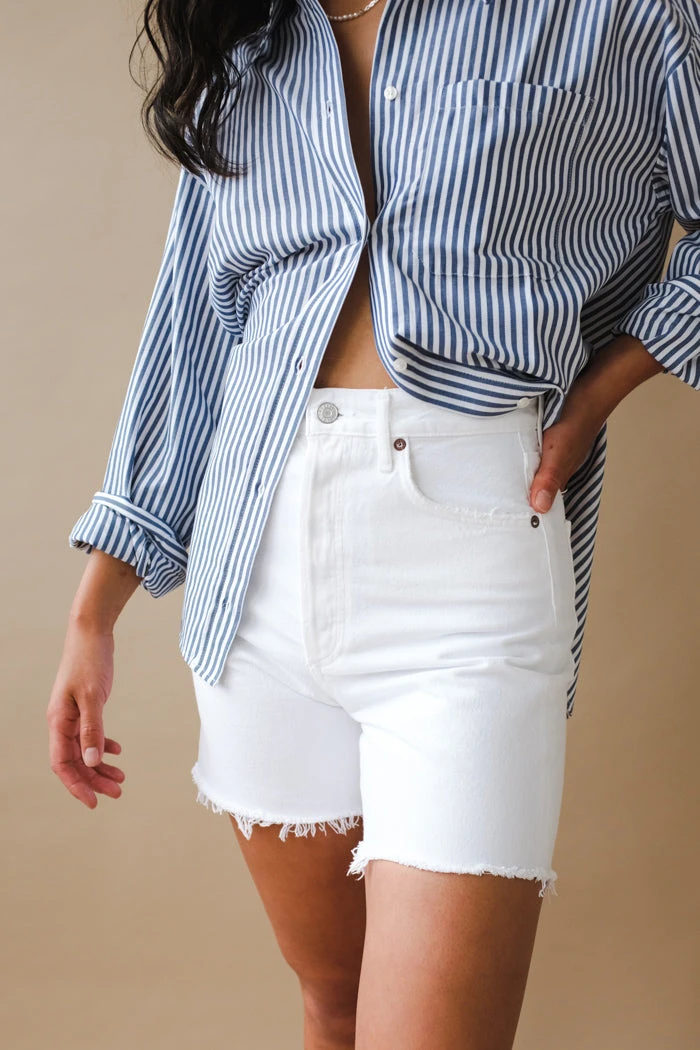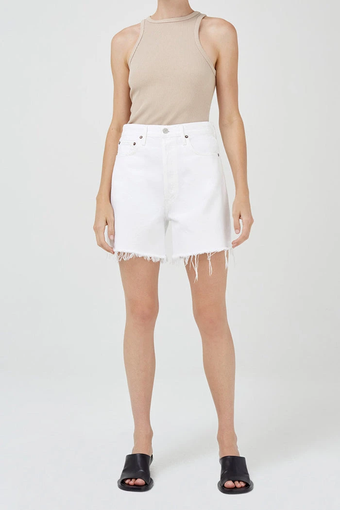 Agolde Stella high waist denim shorts in clean white denim risk wash with raw hem. Cut with a cinched, high waist and relaxed silhouette with room through the thigh. Designed with an angled hem for an ultra-flattering fit. Button fly.