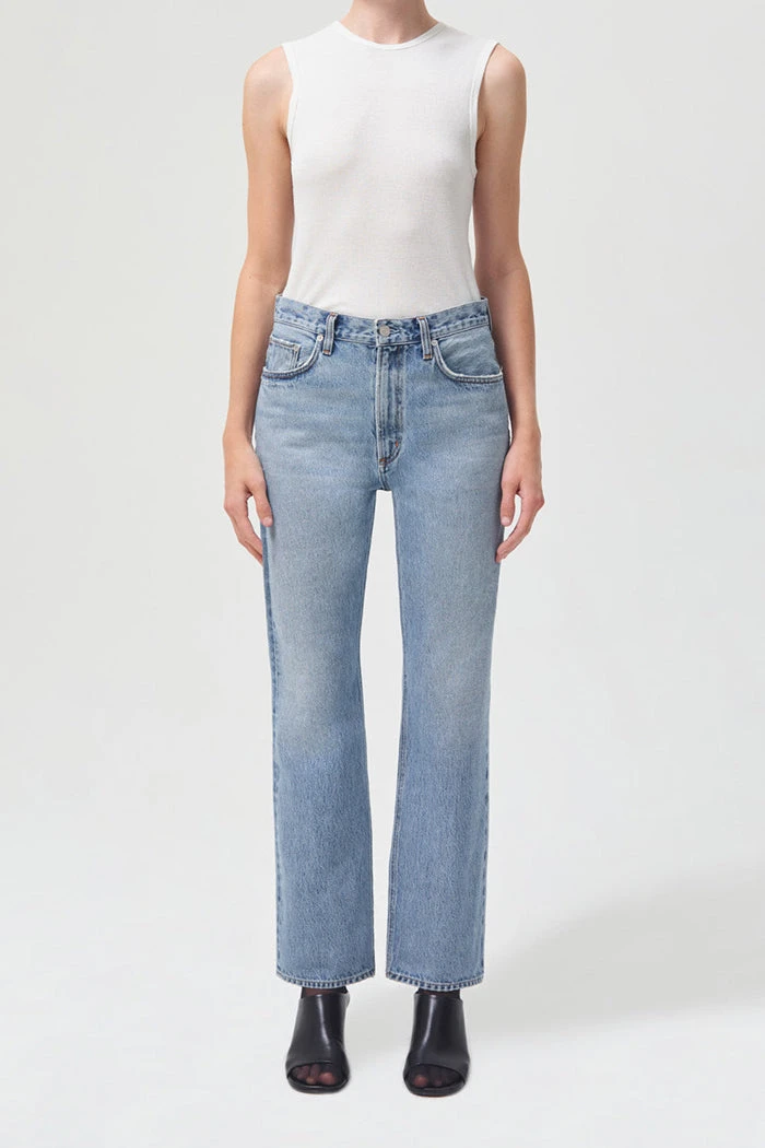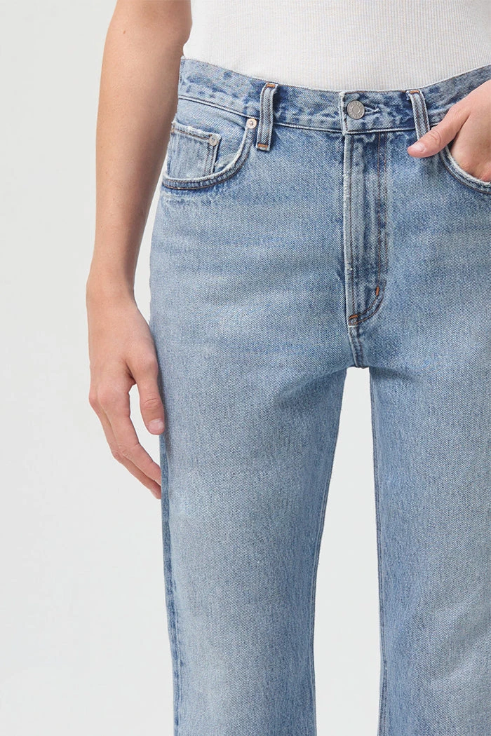 Agolde 28.5″ inseam vintage high rise boot in sway wash. This high rise classic boot silhouette features a flattering top block, slim fit through the thigh and elongating full length inseam. Zip fly.