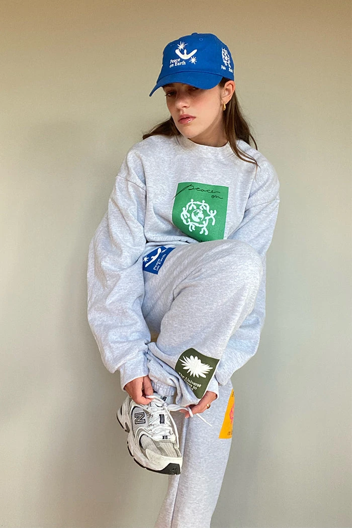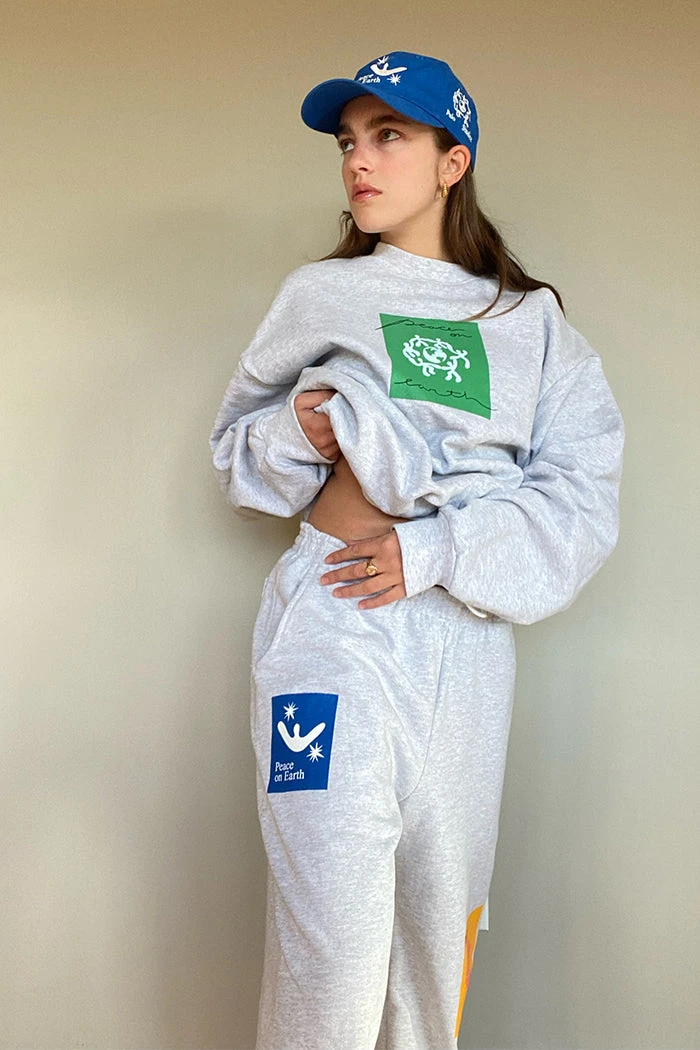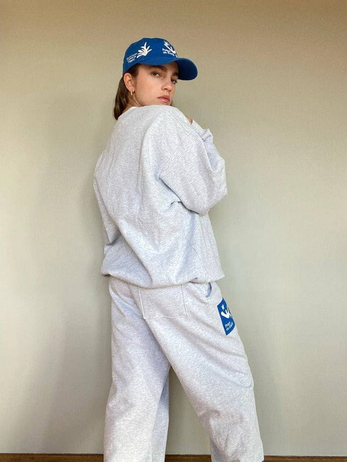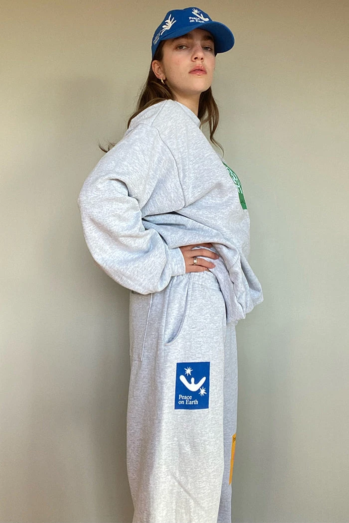 Palo Studios Art Poster screen print oversized sweatpant in vintage grey. “Art Poster: Blue Joy, Pink Peace, and Ivy Expansion” design silk screened on the front of the garment. This design is an original Palo Studios artwork, created by Los Angeles based digital artist, Will Sinclair.Â