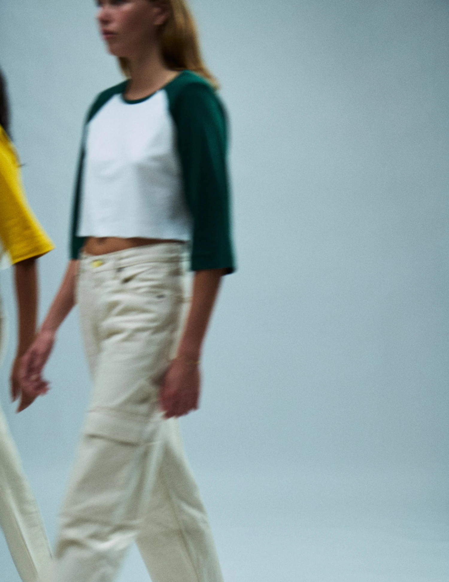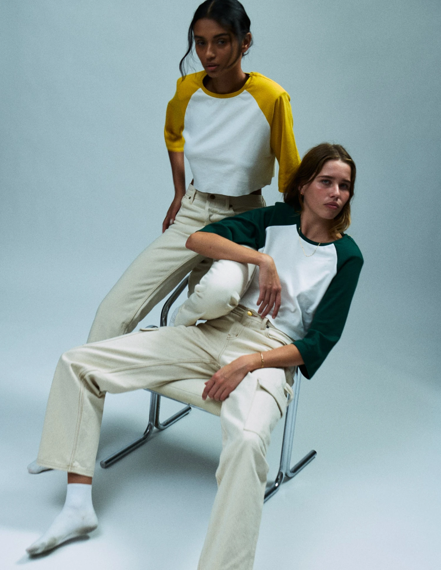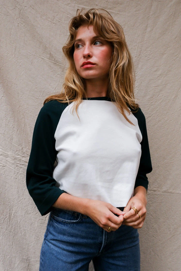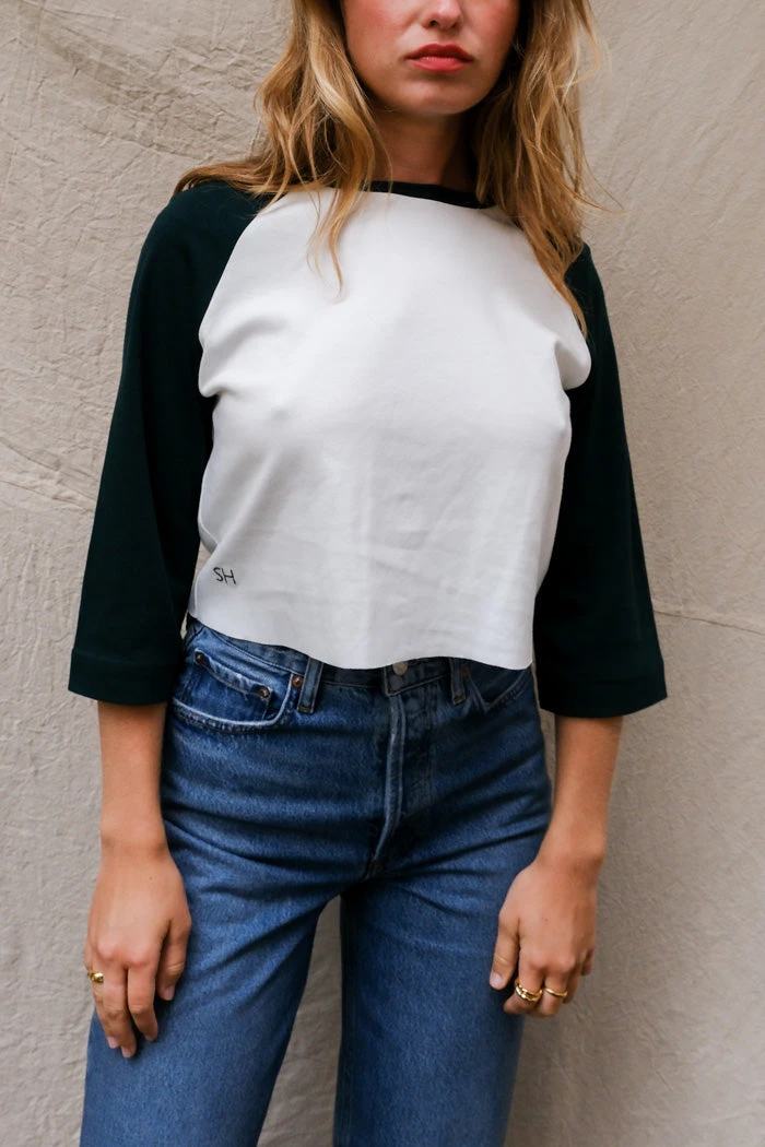 Still Here cropped baseball tee with light shoulder pads in hunter green and white. Boxy fit, 3/4 length sleeves, and SH embroidered detail.Â
