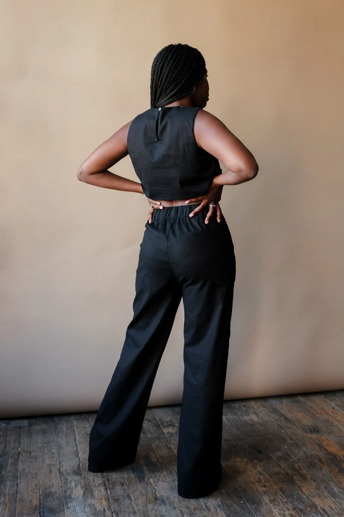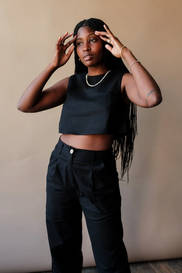 Bekah black linen crop top. Pair with the Jules trouser for a matching set.Â