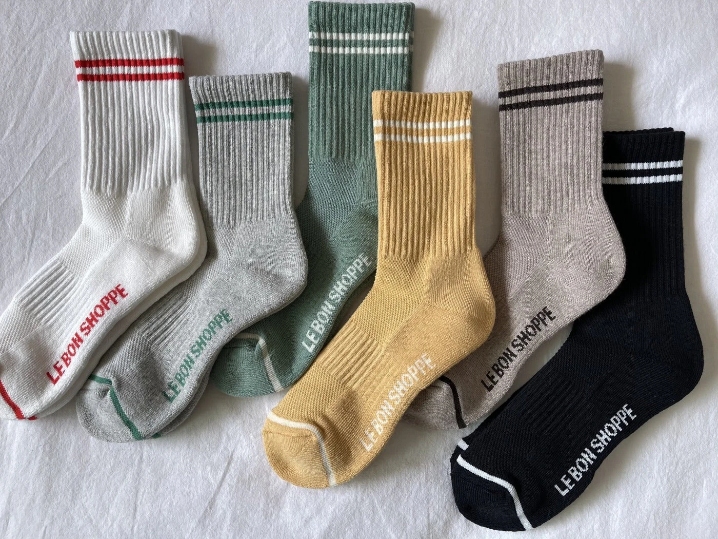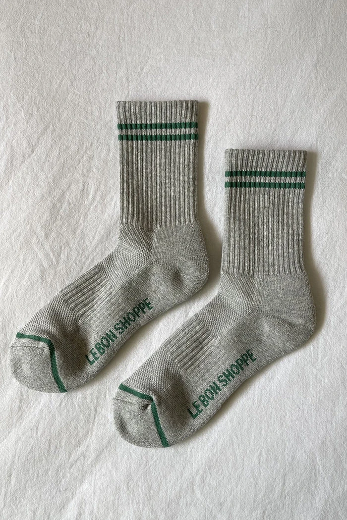 Le Bon Shoppe Boyfriend socks in light grey with green stripes. Stay fly all year long in these calf length sports socks. Pair with sneakers or sliders. Perfect for work from home.