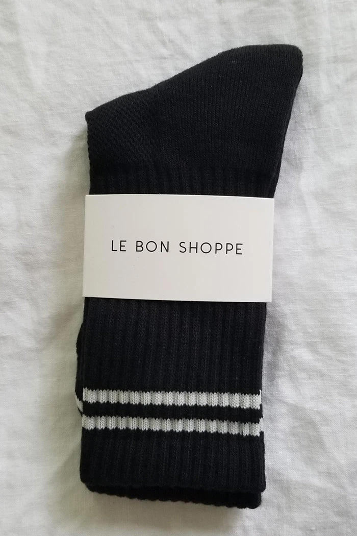 Le Bon Shoppe Boyfriend socks in black noir. Stay fly all year long in these calf length sports socks. Pair with sneakers or sliders. Perfect for work from home.