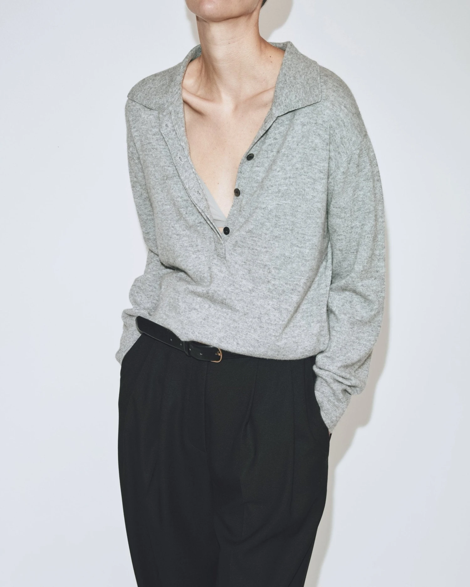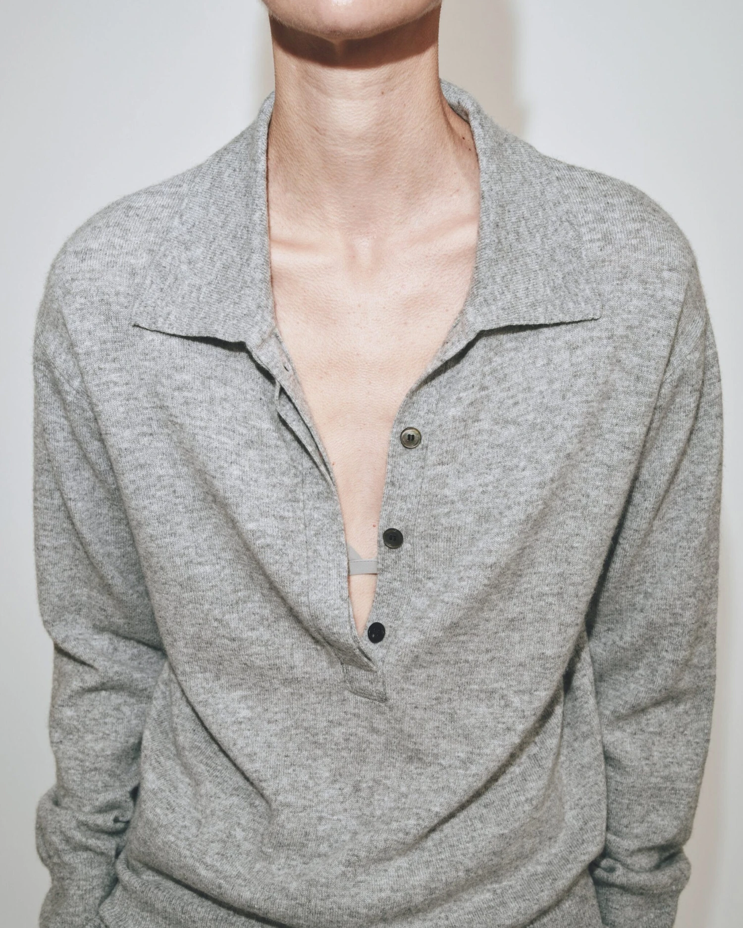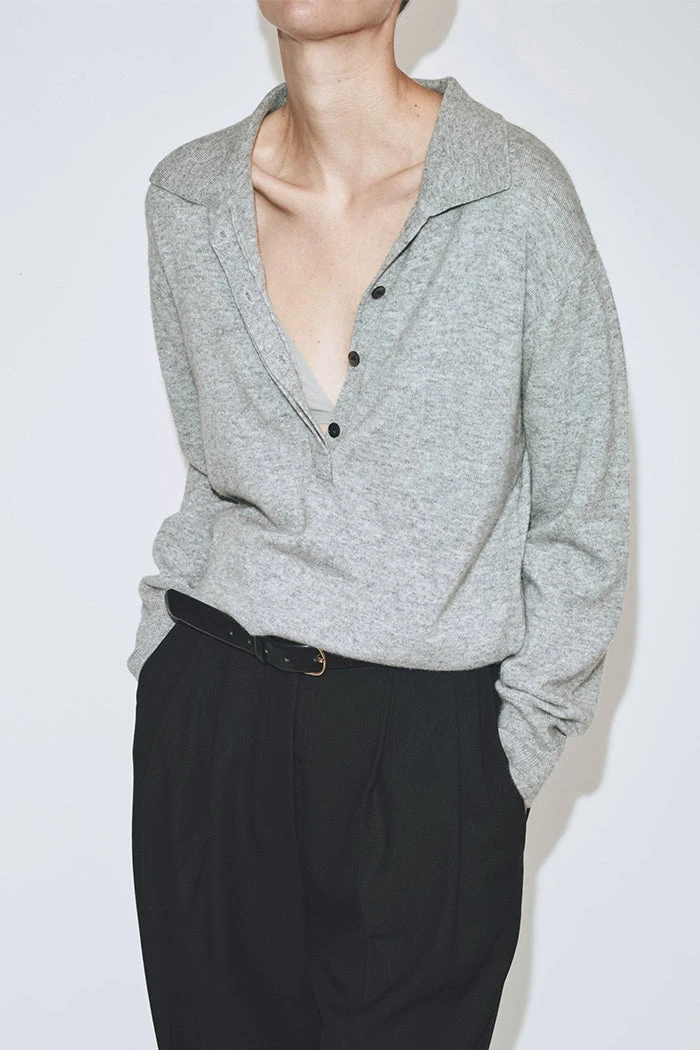 Mijeong Park cashmere blend polo sweater in grey with partial button placket.Â