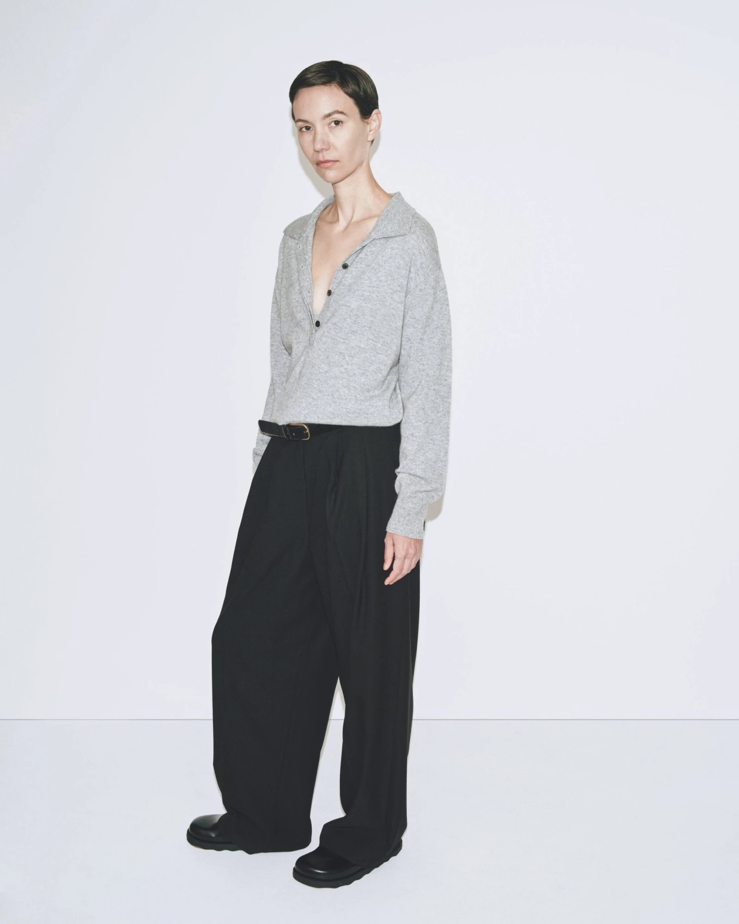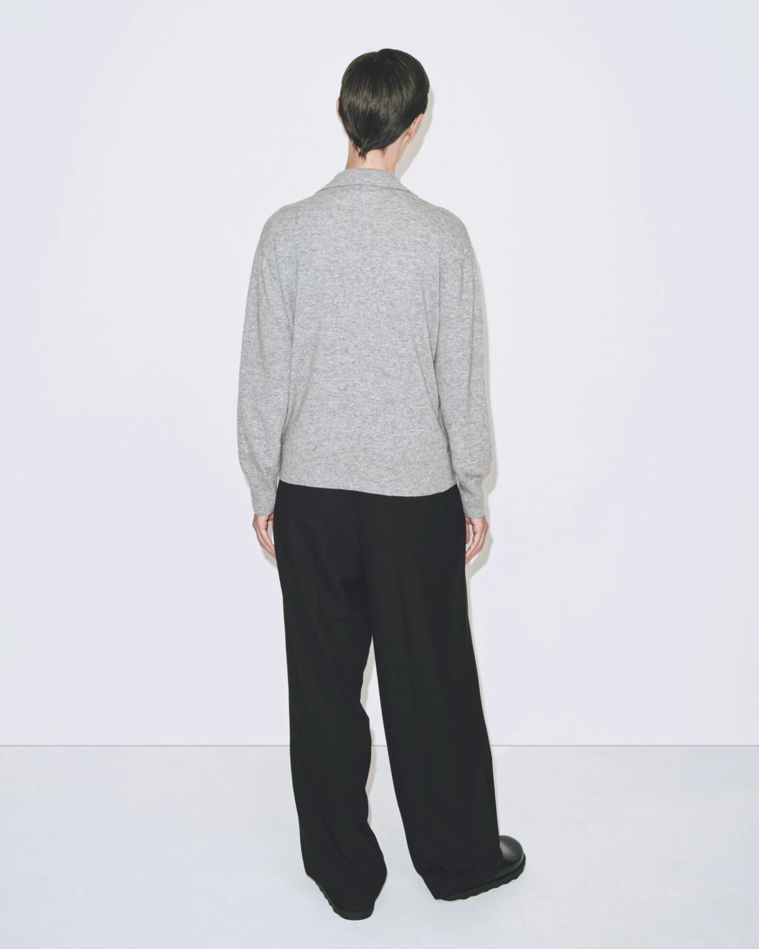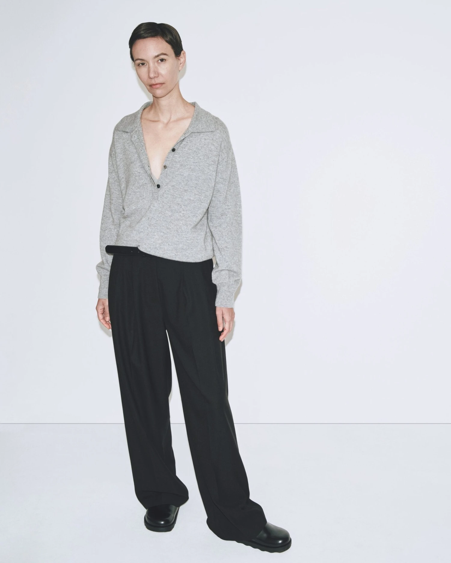 Mijeong Park cashmere blend polo sweater in grey with partial button placket.Â