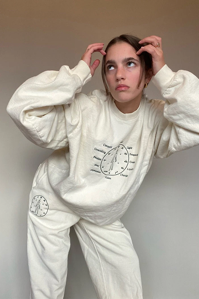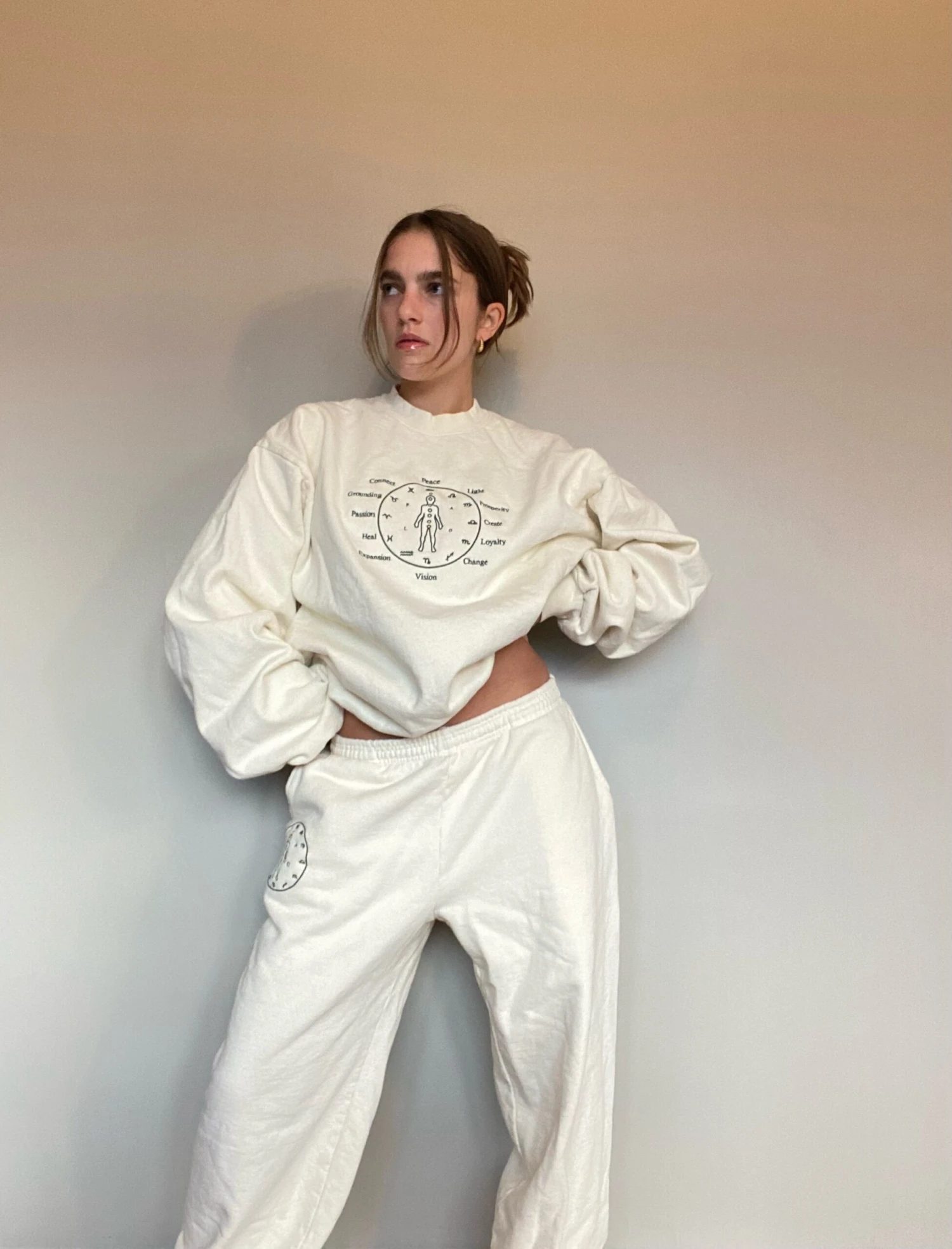 Palo Studios centered crew embroidered sweatshirt in tofu with evergreen embroidery. This design is an original Palo Studios artwork, created by Los Angeles based digital artist, Will Sinclair.Â