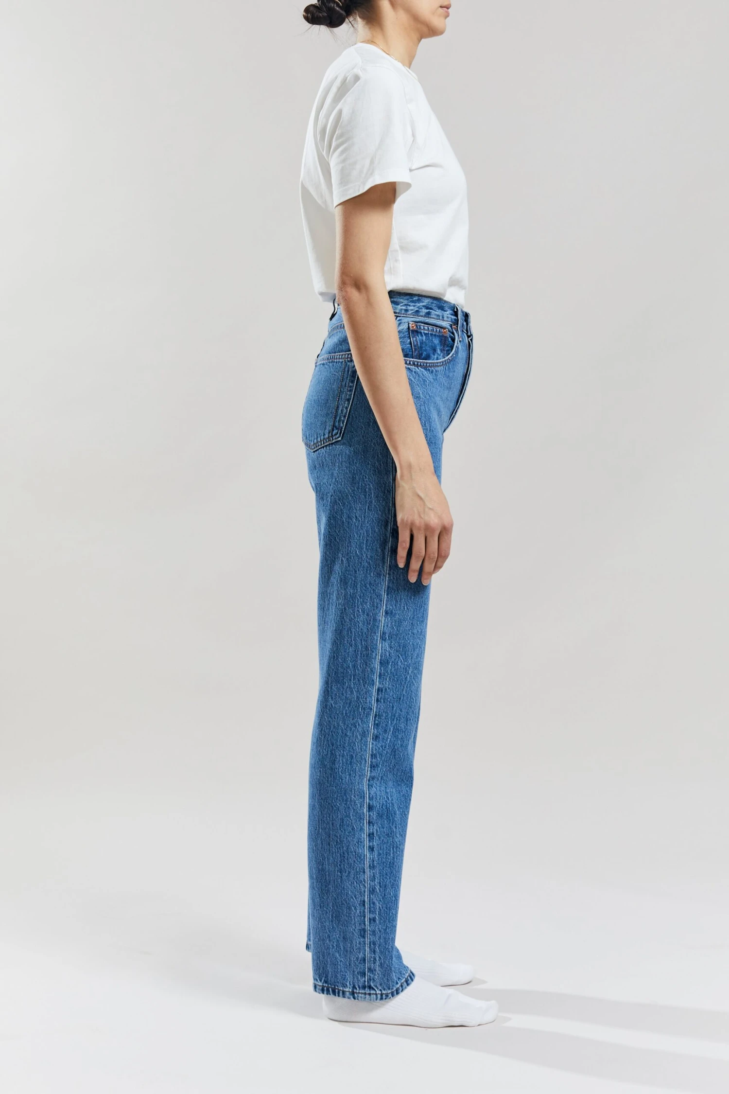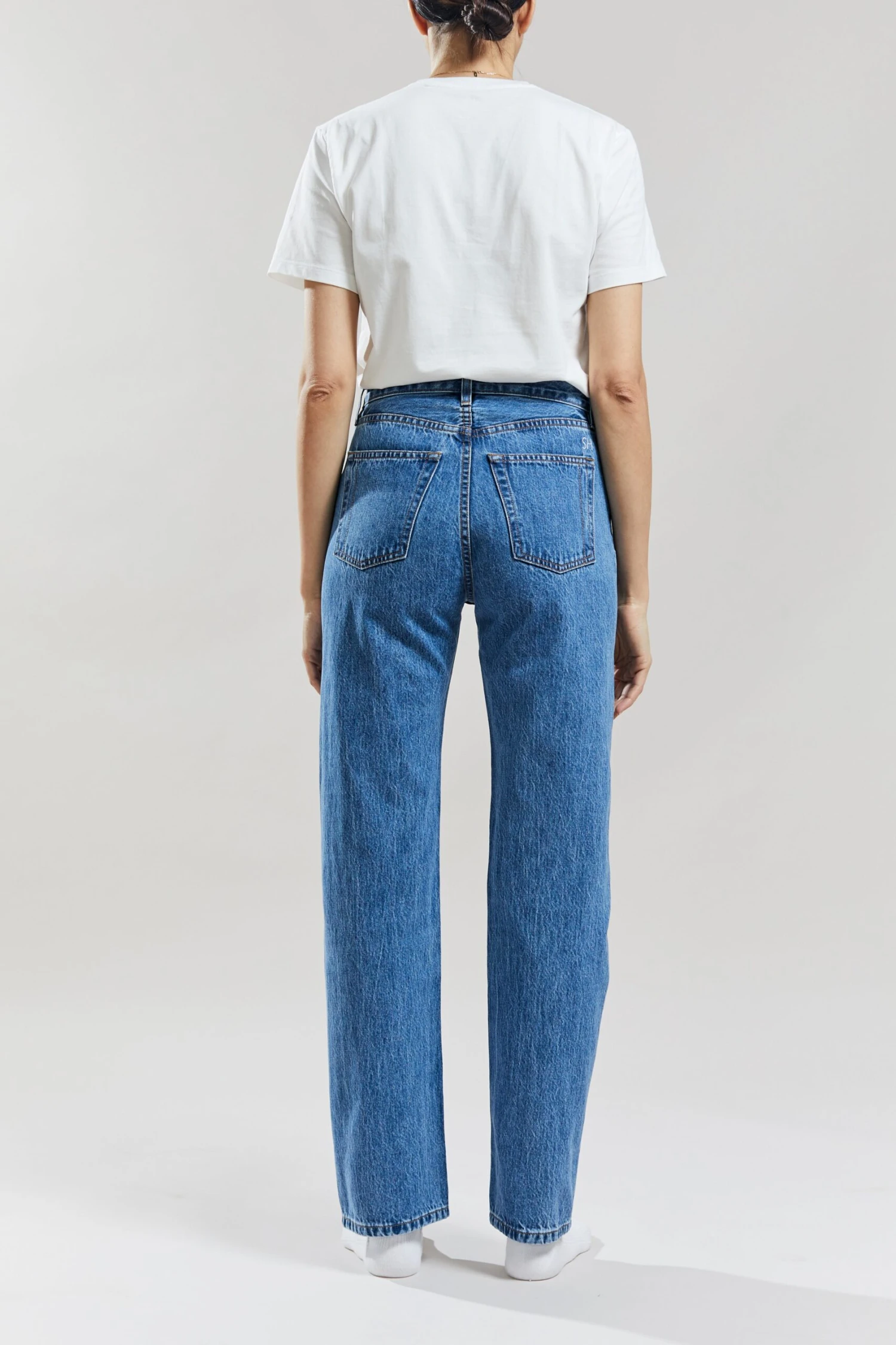 Still here Childhood jeans in Classic Blue is inspired by the “anti-fit” simplicity of your favorite childhood jeans. It’s a relaxed leg, super hi-rise, wedgie fit. It features a traditional button fly and our signature ‘SH’ embroidery. The Childhood is our original cool-girl jean.