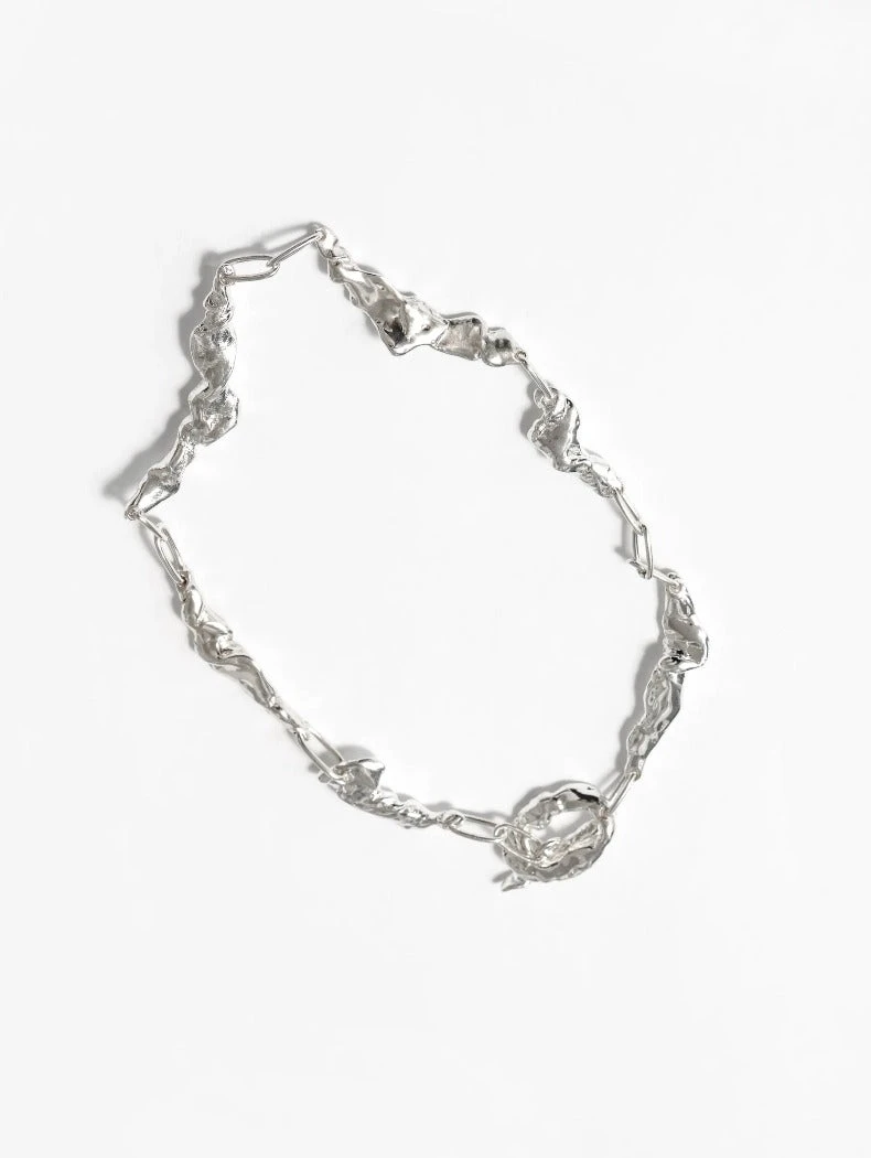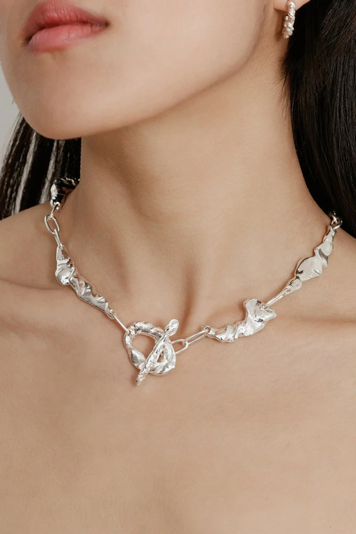 16″ silver plated bronze organic necklace with toggle. Chain measures 14mm in width.