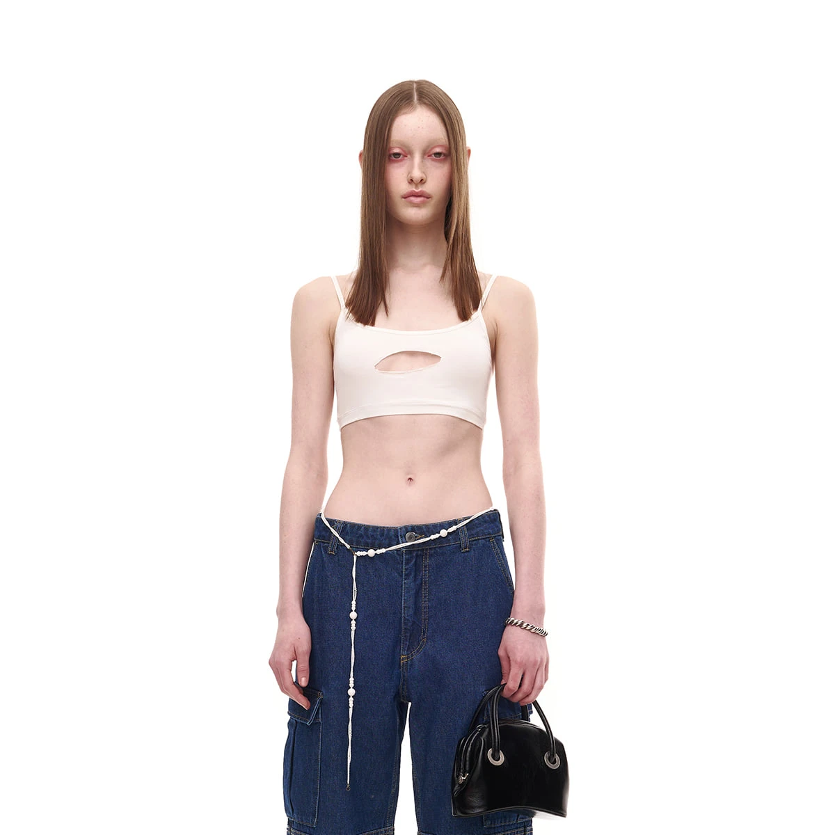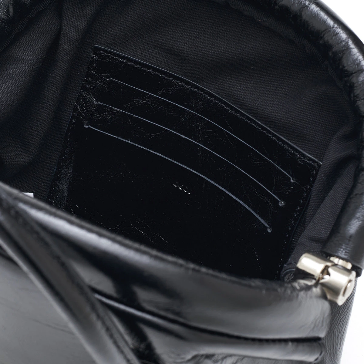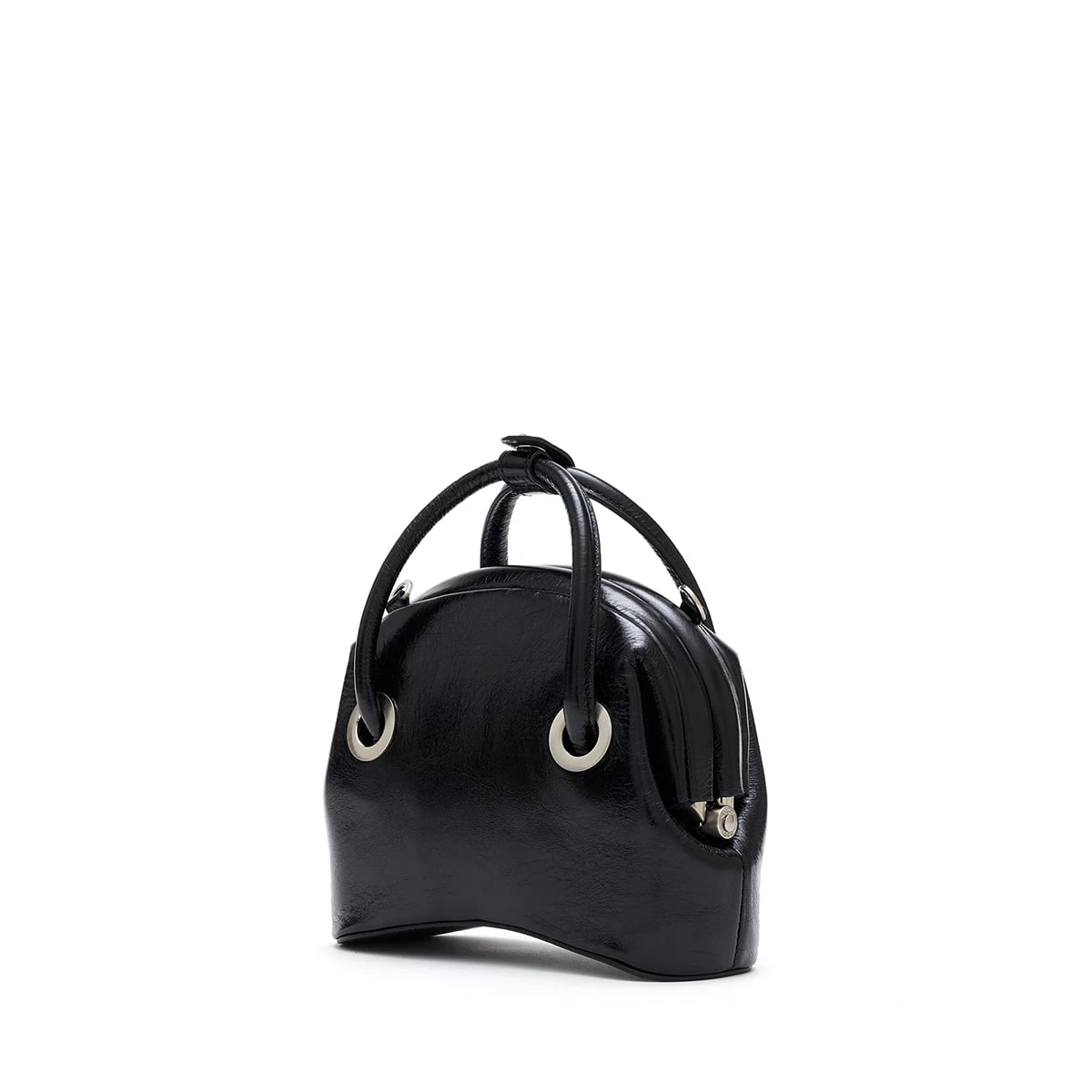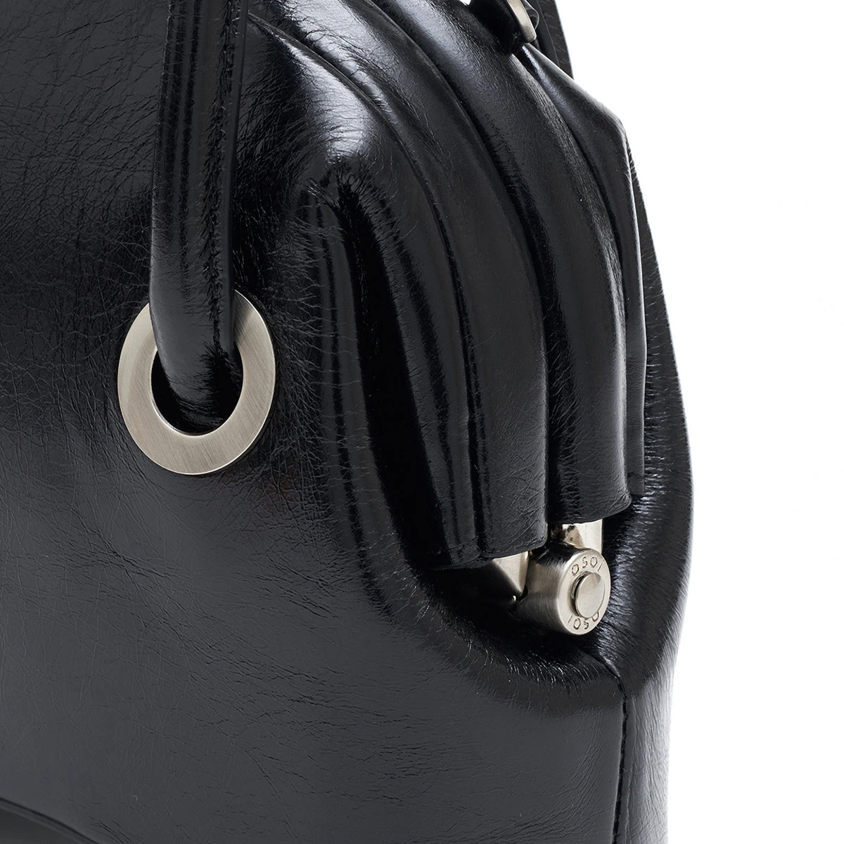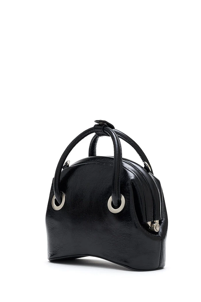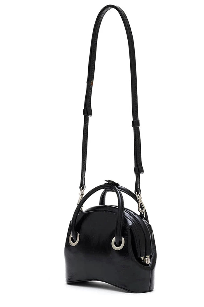 Osoi Circle mini top handle bag in washed black leather with adjustable and detachable long shoulder strap for a crossbody option. Leather has an irregular cracked looked for a worn in look. Rolled handles, curved base, and hinged closure.