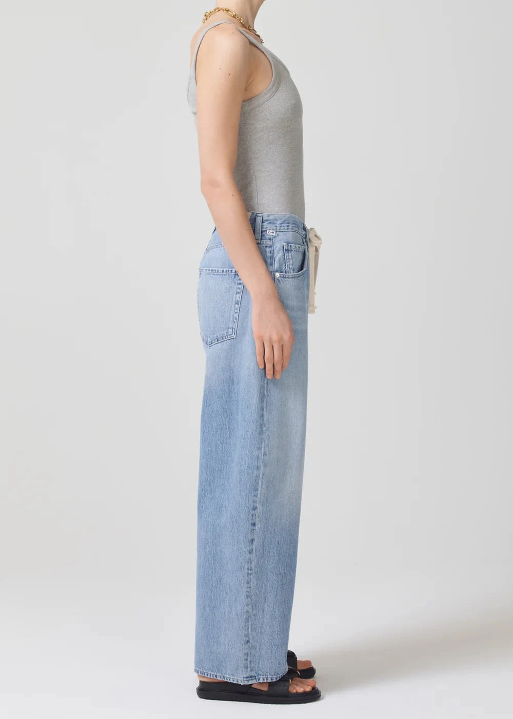 Citizens of Hummanity Brynn drawstring trouser jeans in blue lace wash. The Brynn Jean is cut in a lightweight denim and designed with a wide leg, a drawstring waist, and a full length inseam. Light, vintage indigo with heavy fading and soft whiskering down the leg, finished hems. Midweight, rigid, organic cotton with relaxed drape for ease. Button fly.