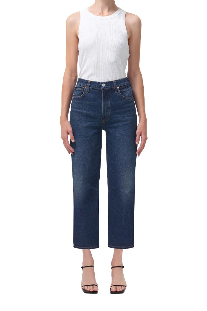 Citizens of Humanity Florence straight leg jean in dark blue everdeen wash. The Florence is an easy, mid rise with a straight leg that skims the body. Dark indigo with slight whiskering and subtle fading with a clean hem. Comfort stretch denim with a super soft hand for all day wearability. Button fly.