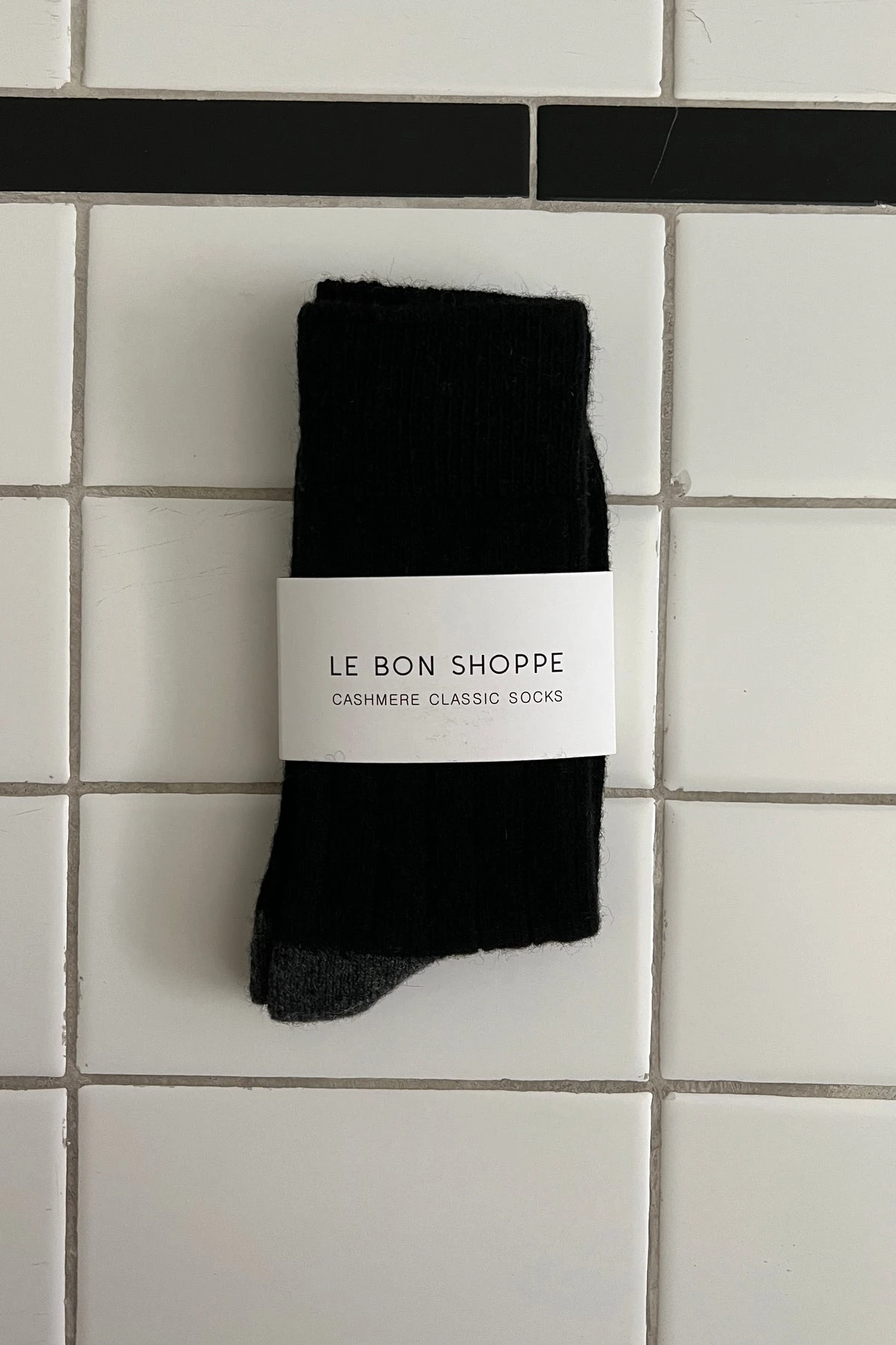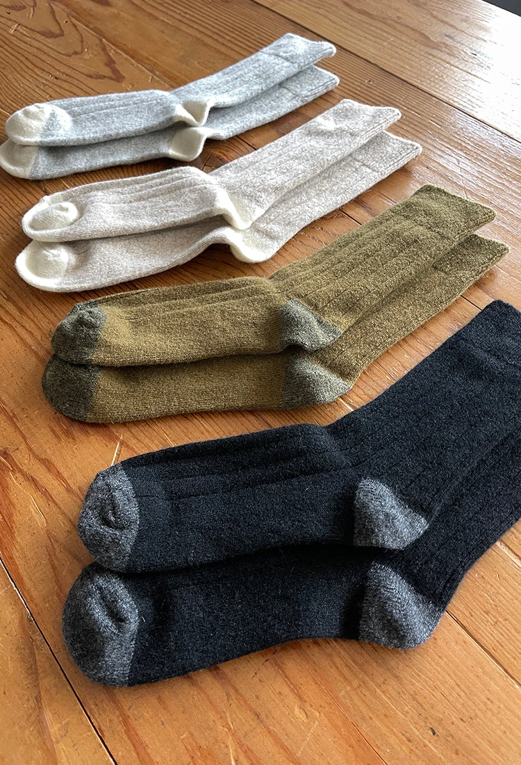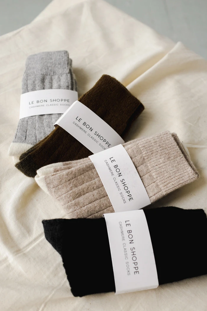 Le Bon Shoppe classic cashmere socks in black. Vintage-esque Cashmere blended socks with a wide ribbing detail and tonal contrasting heel and toe. This elegant and classic sock will be your go to gal during the colder season.