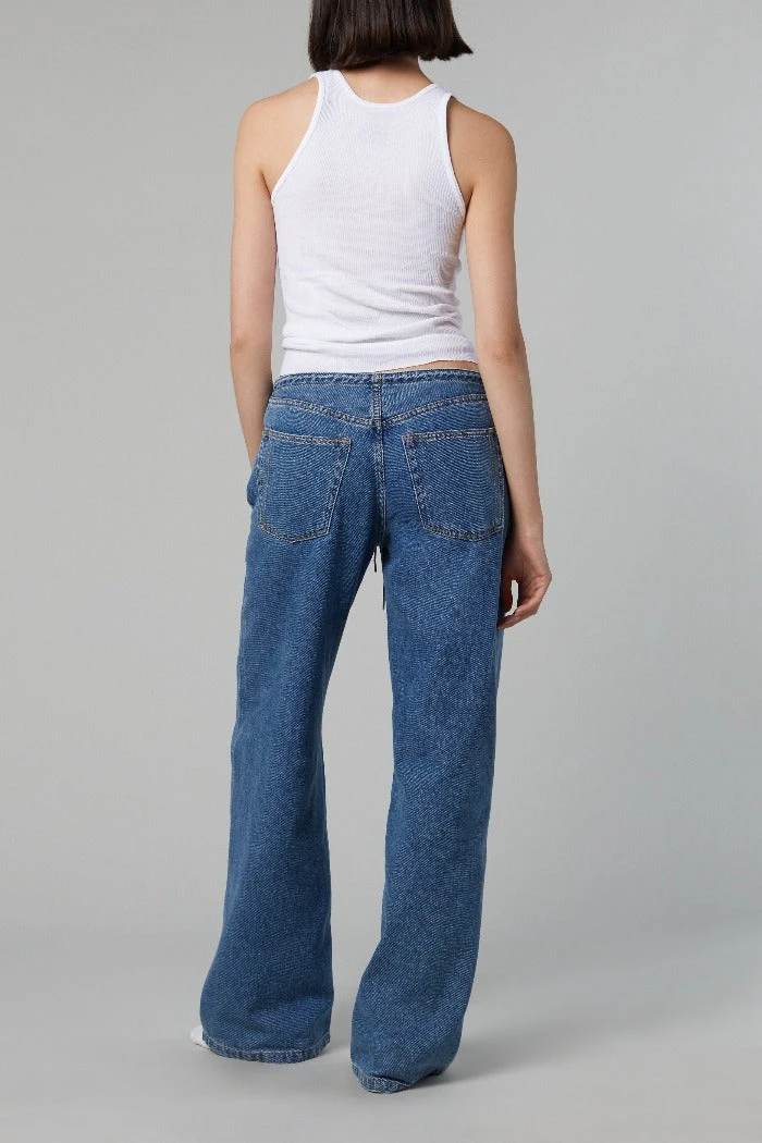 Still Here cool jeans in classic blue. Wide leg, low rise with an adjustable drawstring. The Cool has no waistband. Button fly. 32″ inseam.