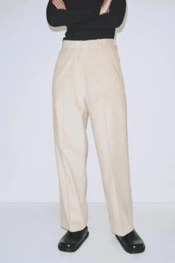 Mijeong Park straight fit corduroy straight leg trousers in light khaki beige. Waistband with belt loops, packets, unlined.