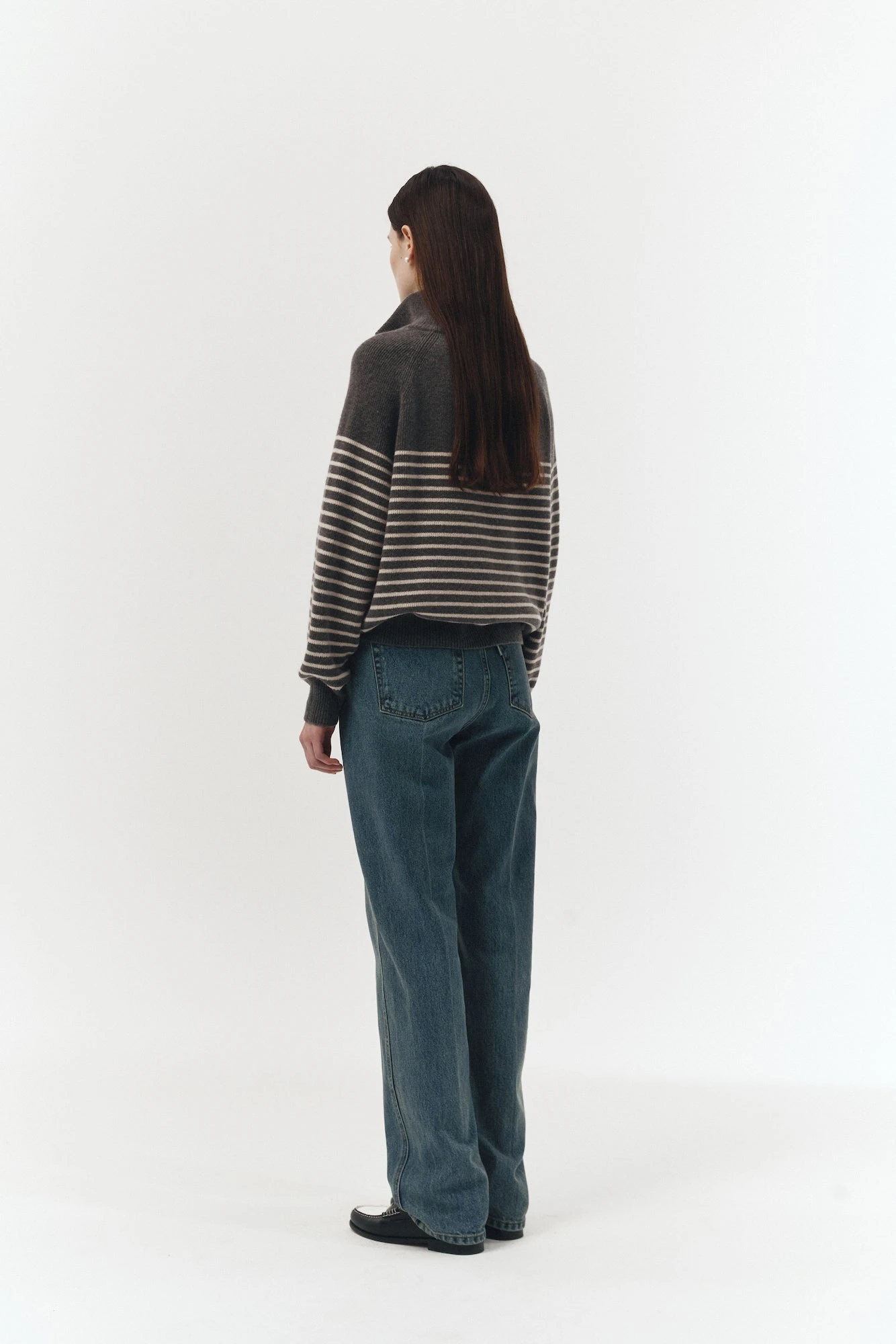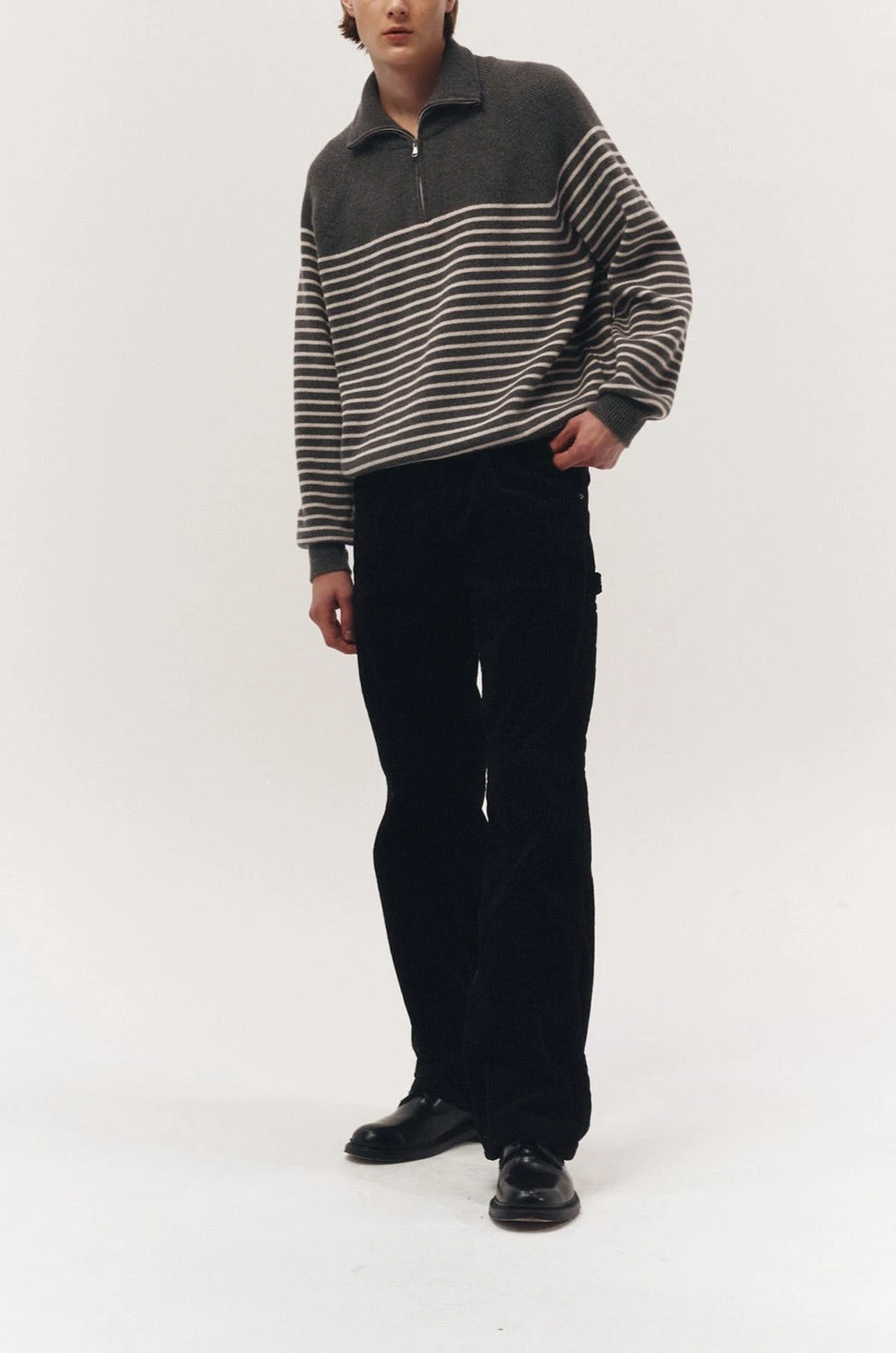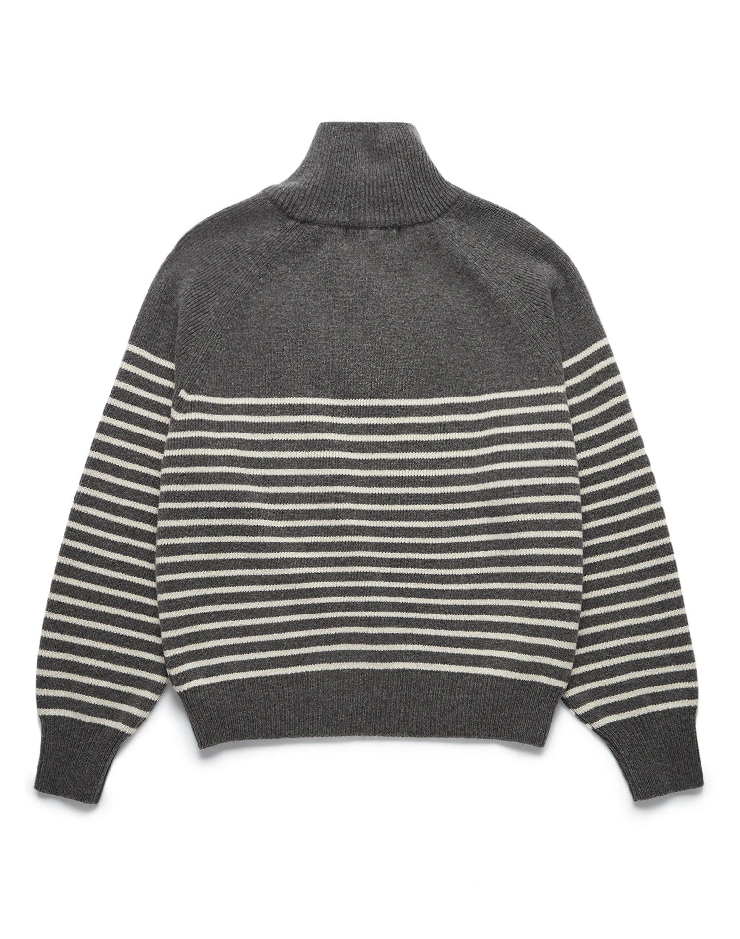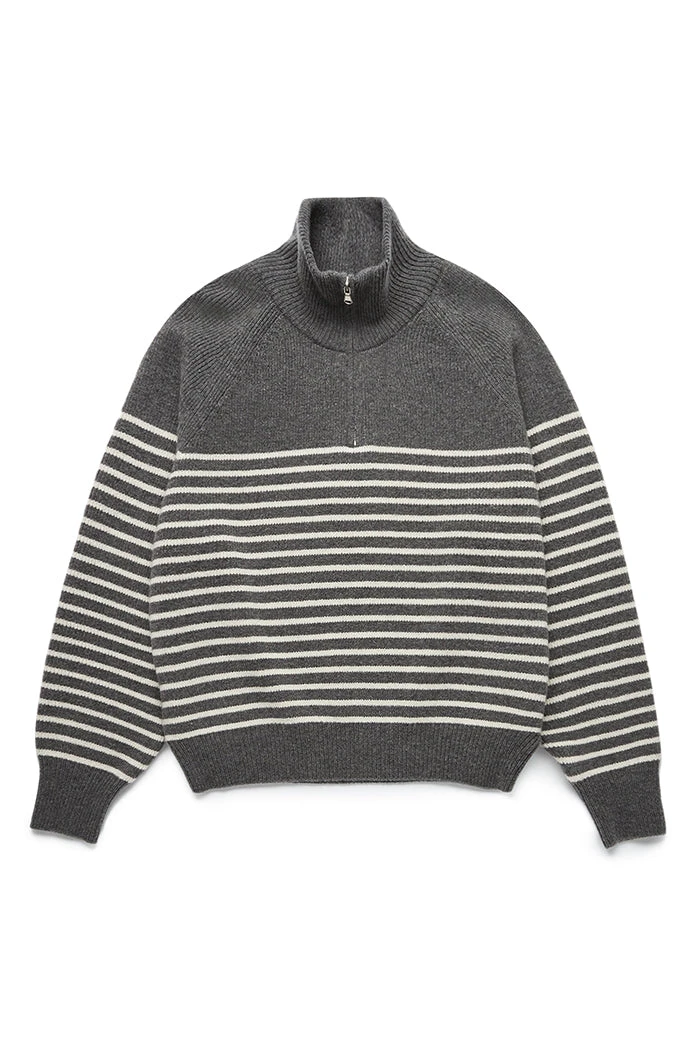 Dunst half zip stripe knit sweater in charcoal grey with cream stripes. Unisex fit.