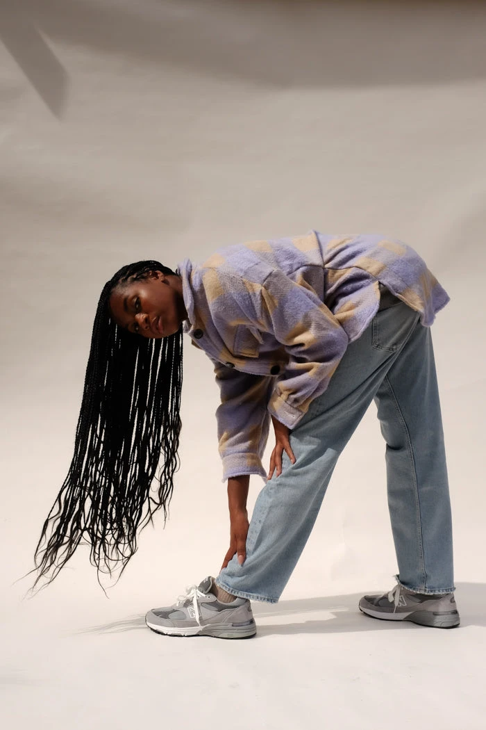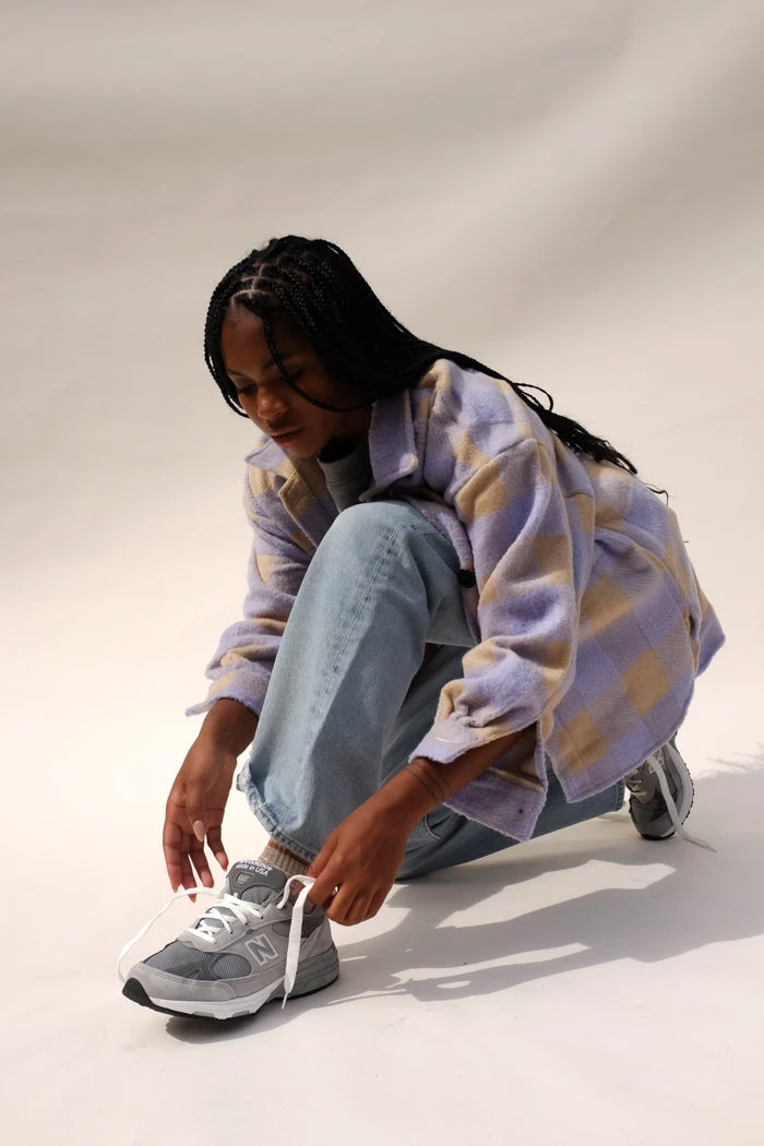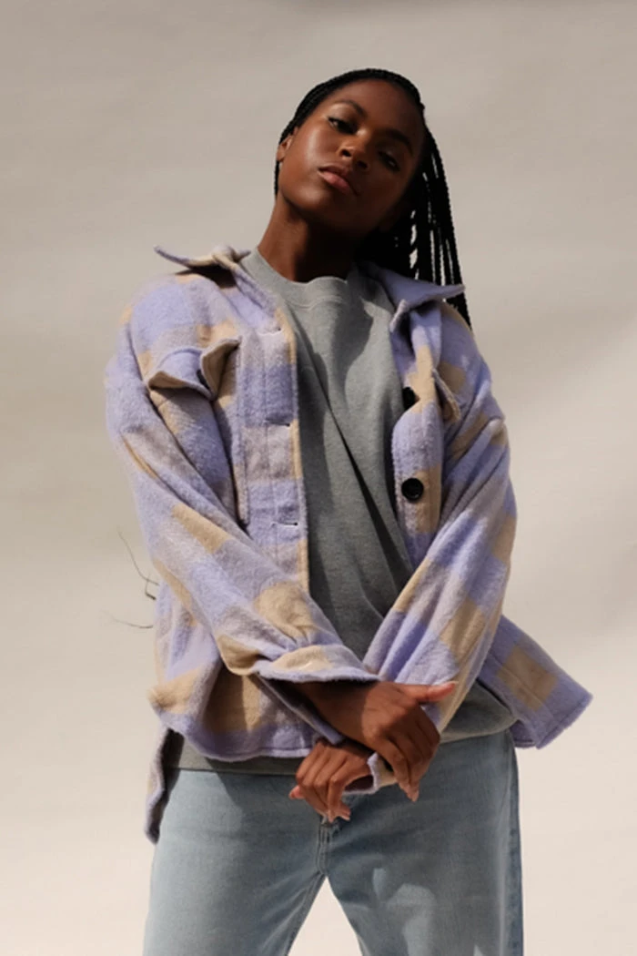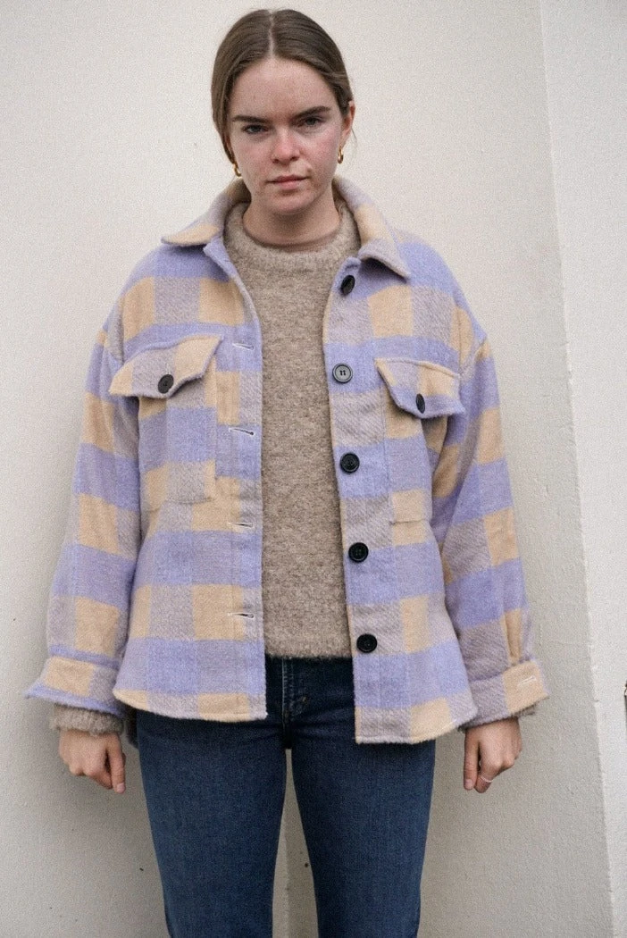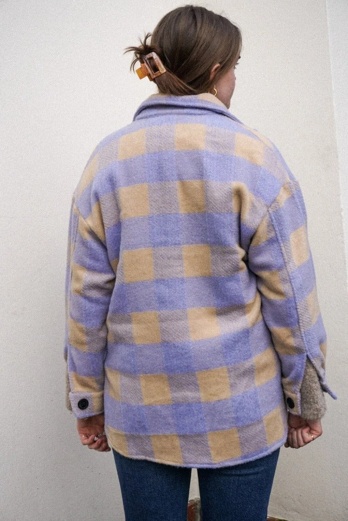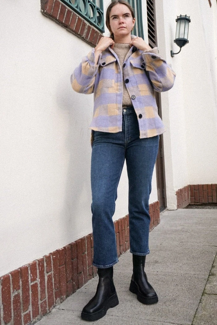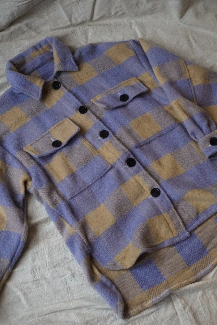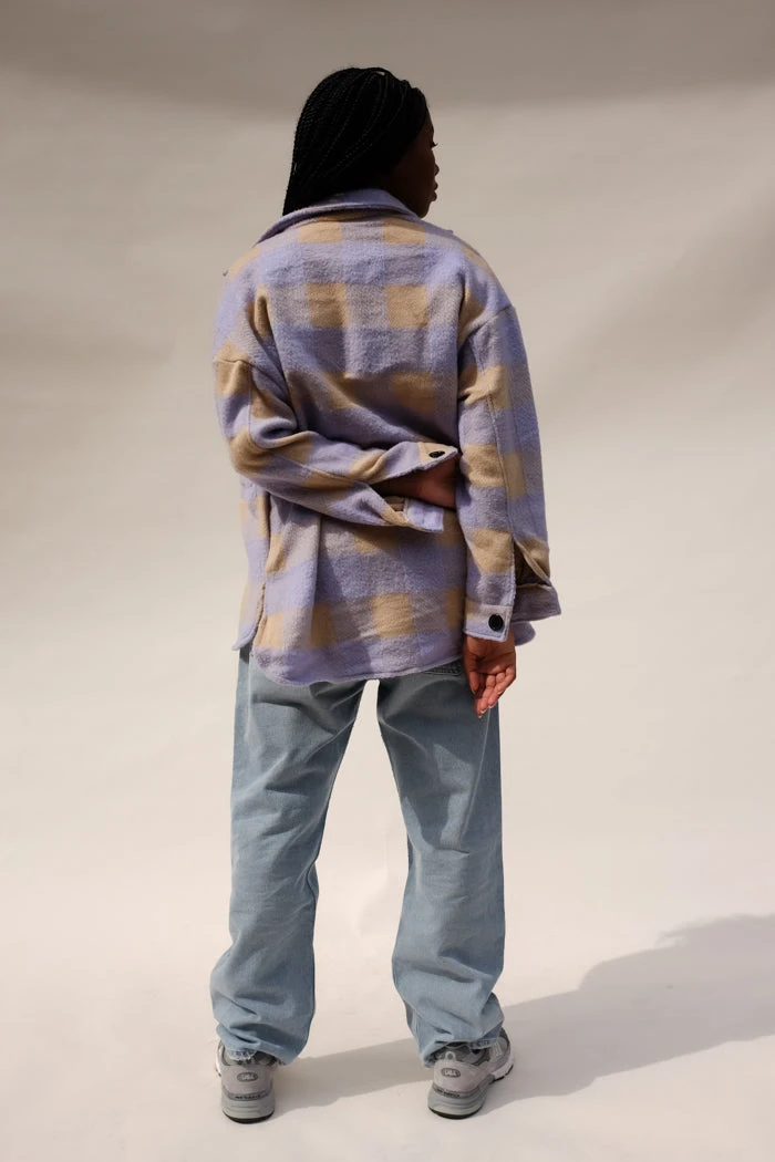 Dylan plaid button up shirt in lilac and tan. 3/4 length sleeves, dolphin hem.