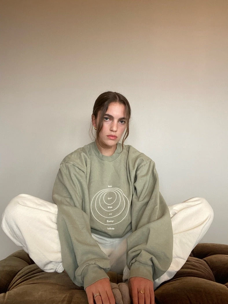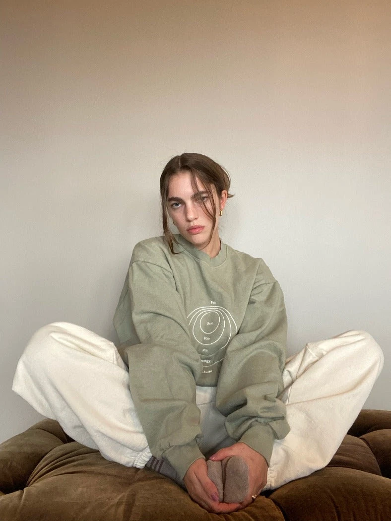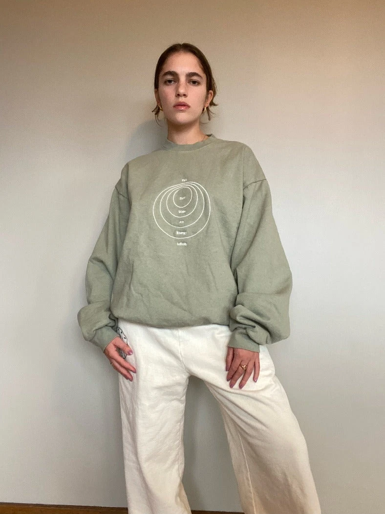 Palo Studios Energetics Sweatshirt in sage green with cream embroidery. Oversized classic crewneck in a vintage-inspired garment wash.