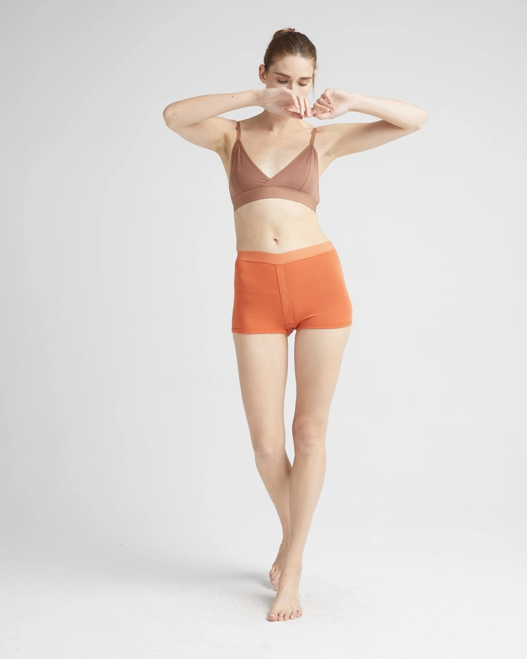 Richer Poorer red orange gingersnap femme boxer briefs. Soft elastic waistband, faux snap detail at front, ultra-soft modal cotton blend, shrink resistant.