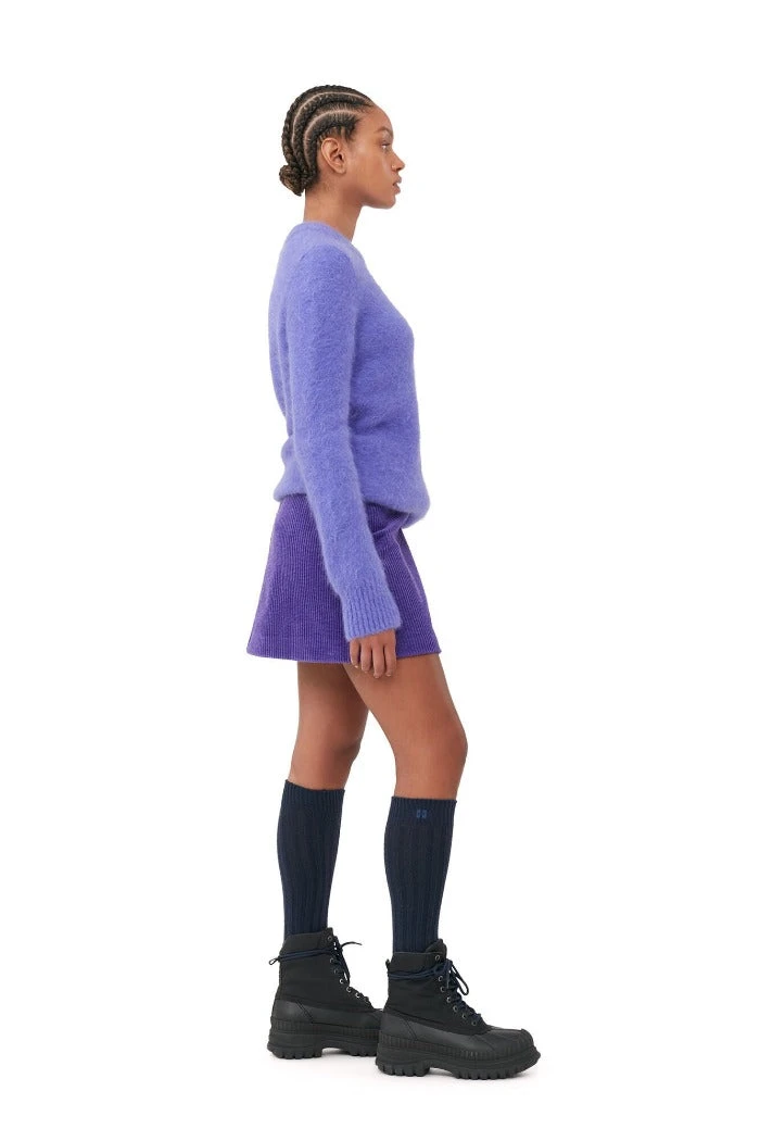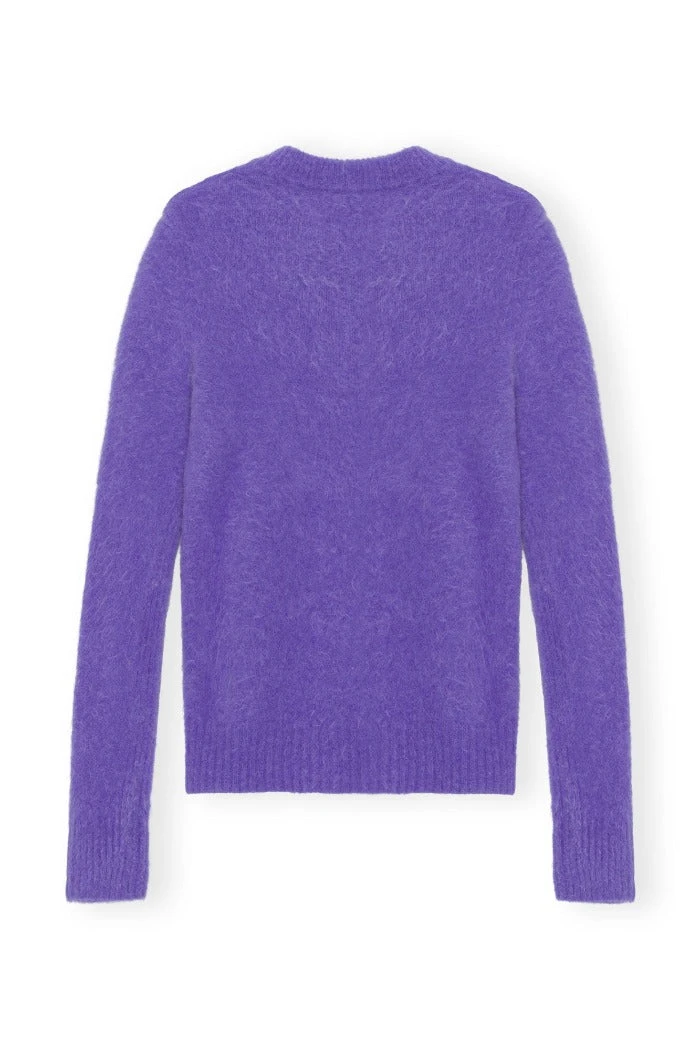 Ganni brushed alpaca o-neck sweater in vibrant simply purple. Designed for a close fit over the shoulders, cut straight from the chest, and ribbed edges.Â