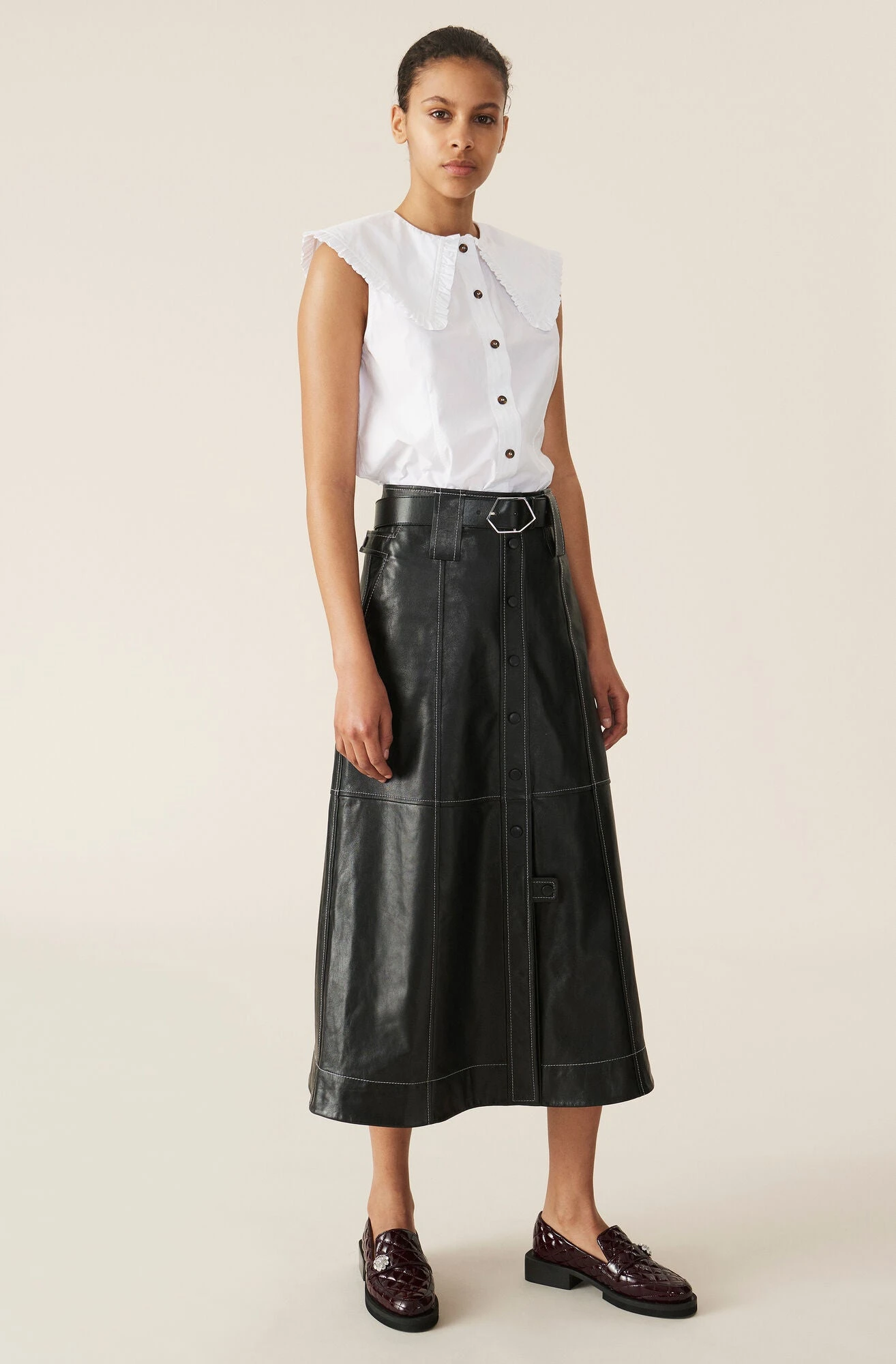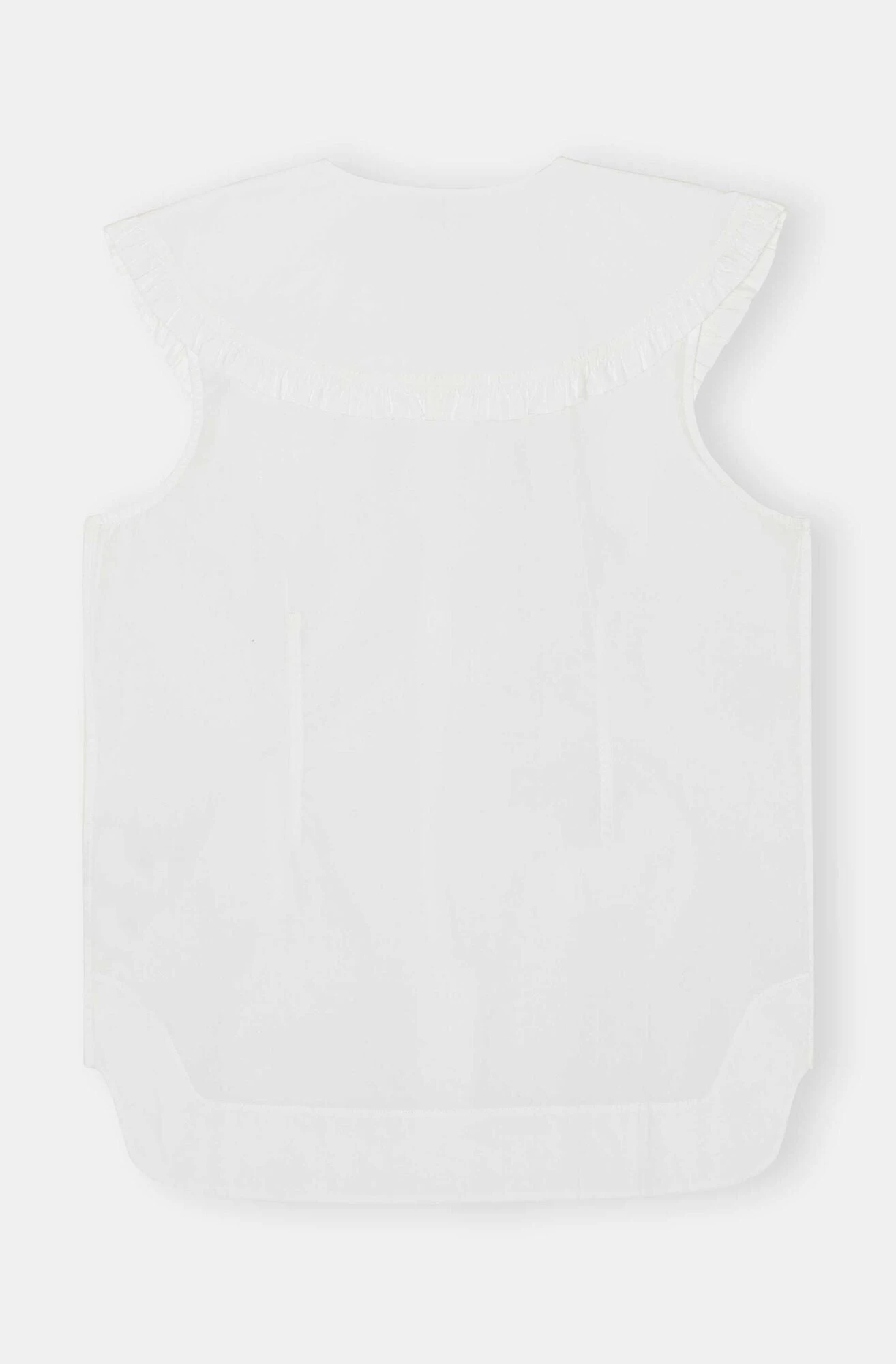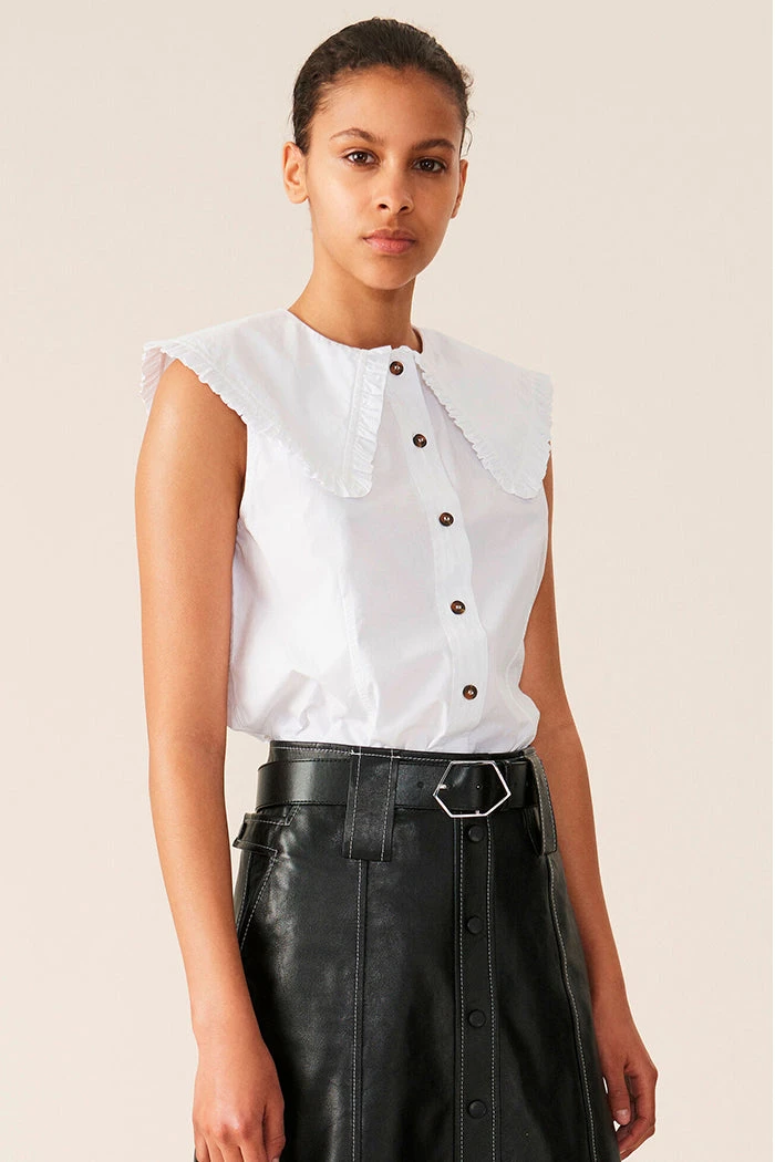 Ganni cotton poplin sleeveless button up shirt in bright white. Finished with Ganni’s signature oversized ruffled peter-pan collar, contrast buttons, and curved side slits. Cut for a relaxed fit with loosely tailored darts.