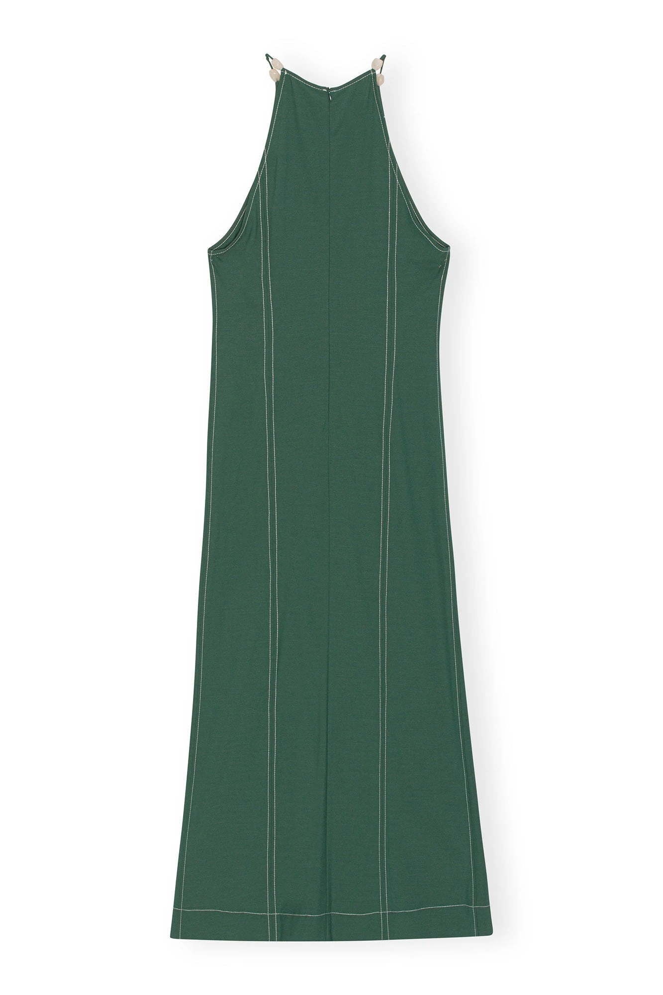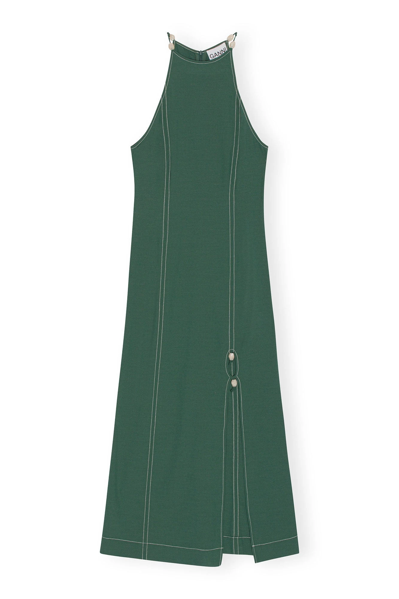 Ganni drapey melange maxi dress in trekking green. The dress is designed for a slim fit and features a round neckline, contrast stitching, beaded detailing, a high slit at the front and a zip closure at the back.