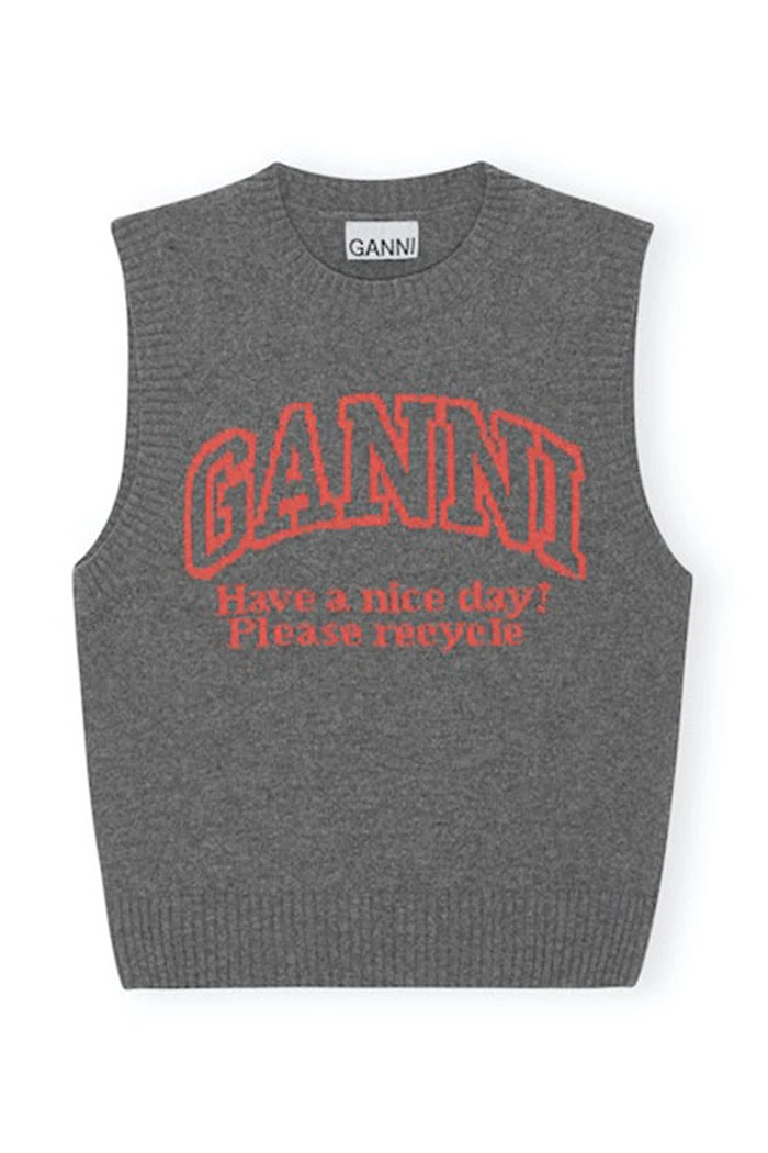 Ganni graphic knit sweater vest in grey with red Ganni logo and slogan “please recycle”.