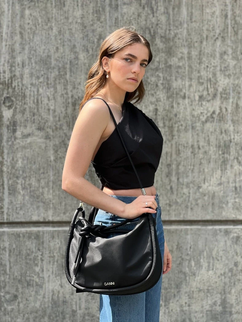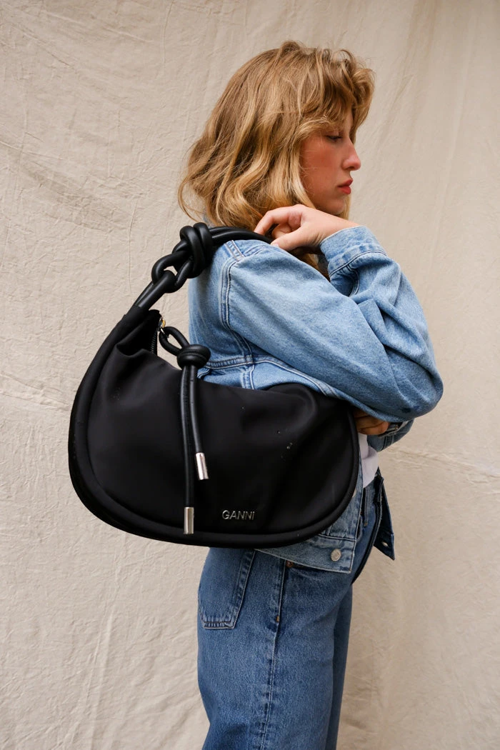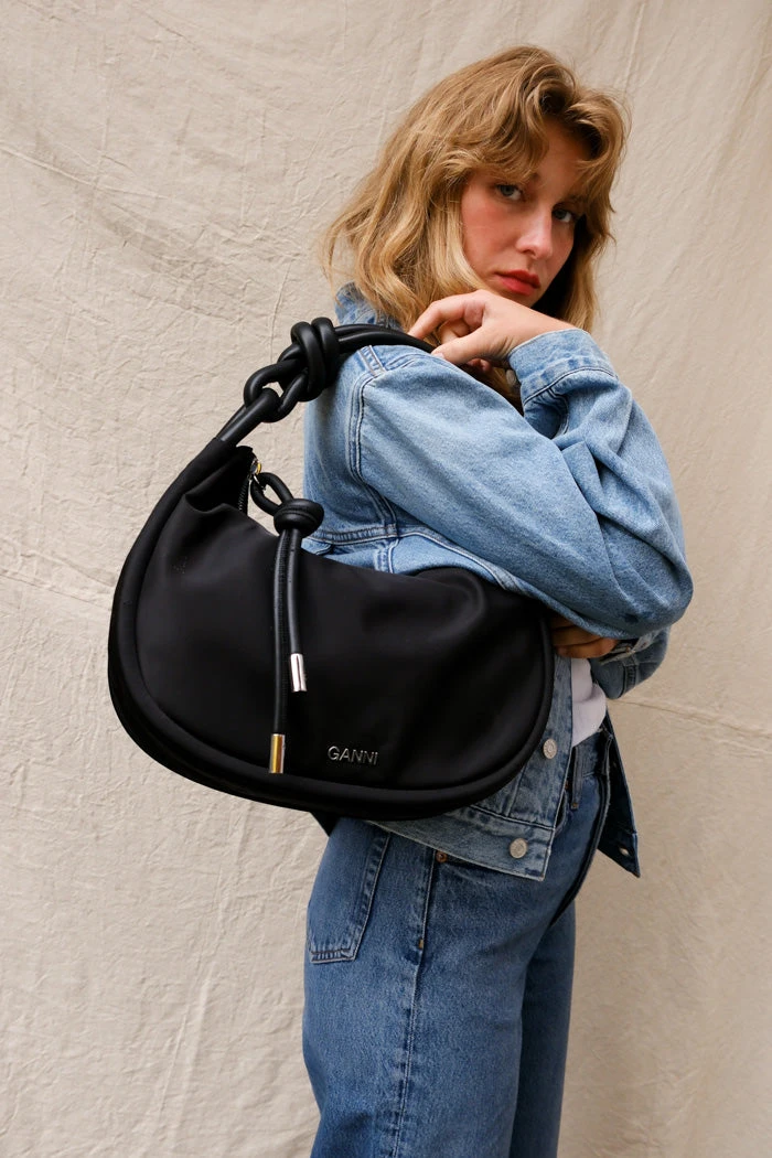 Ganni black knot baguette bag in tech fabric, finished with a silver logo detail and long knotted zipper pull. The knotted cord leather straps extend down the side and base of the bag creating a piping-effect and solid free-standing silhouette. Wear handheld, short on the shoulder, or crossbody using the detachable long strap. Zip closure, one inside zip pocket.