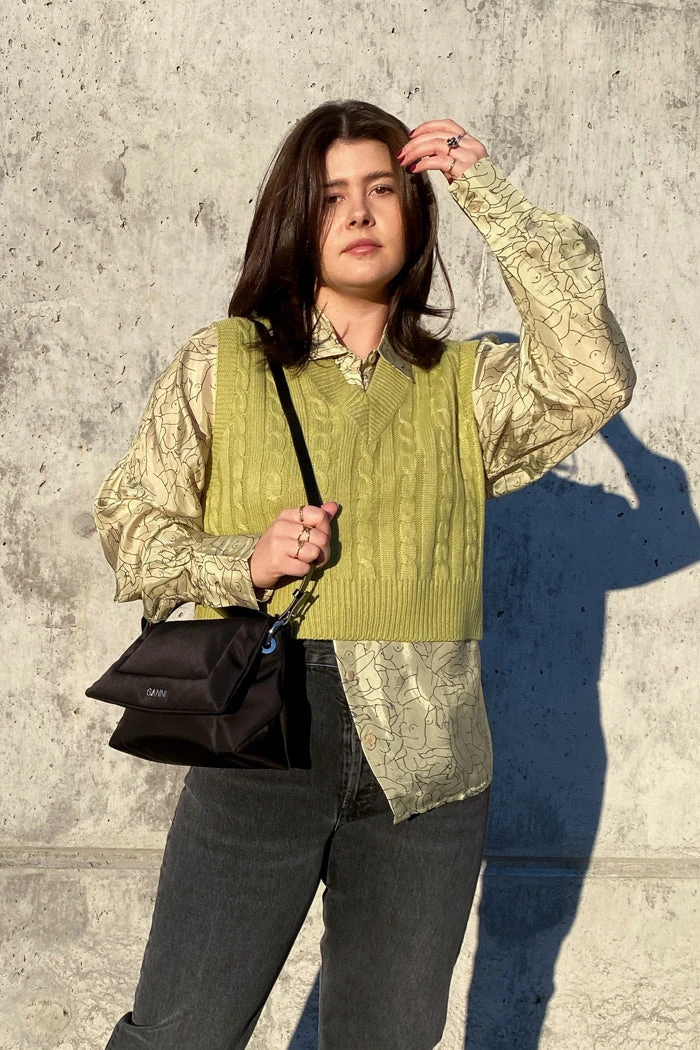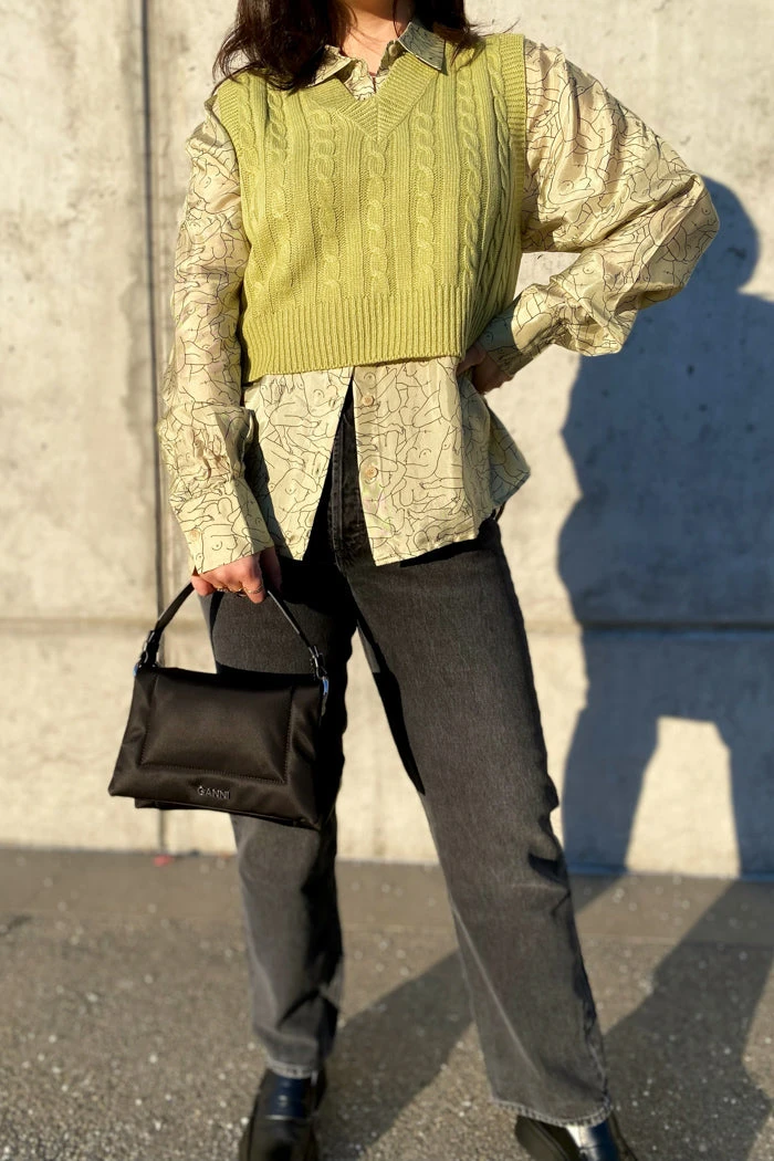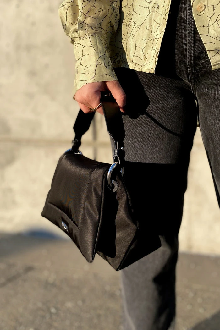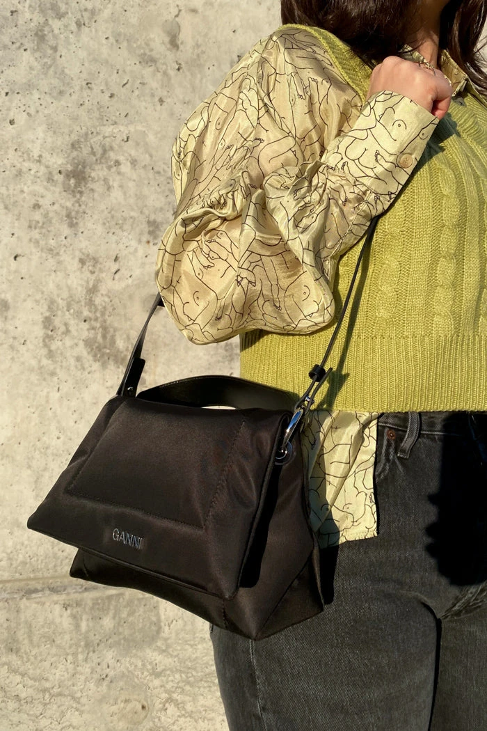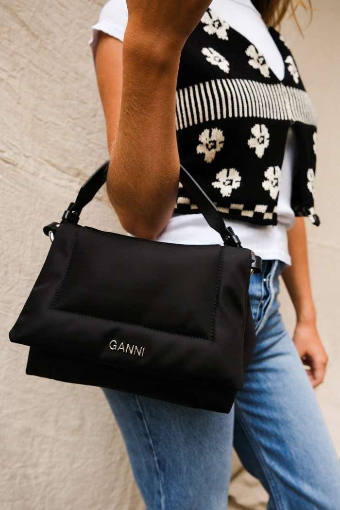 Ganni small pillow flap over handbag. Adjustable long leather shoulder strap and short leather strap.