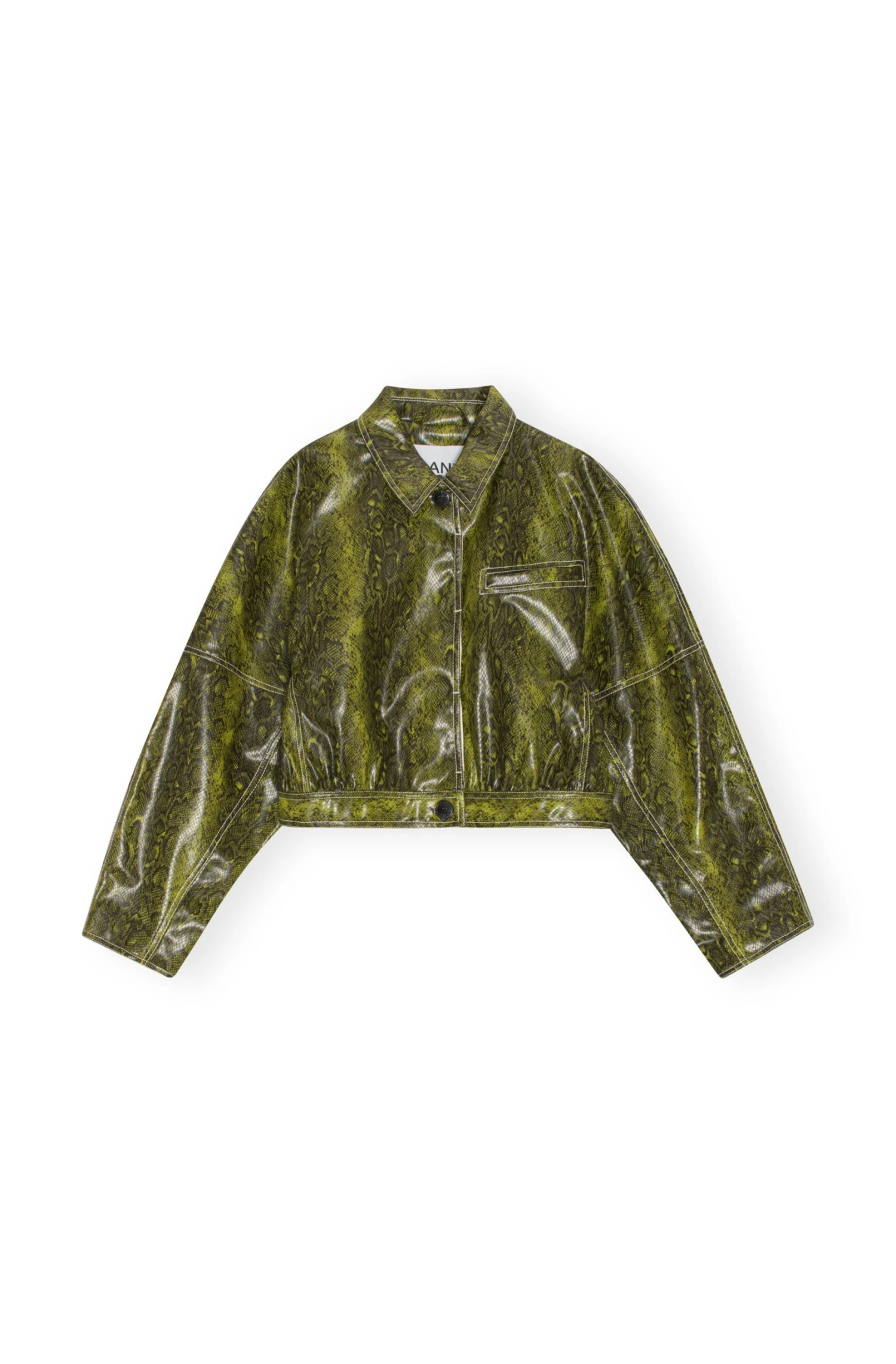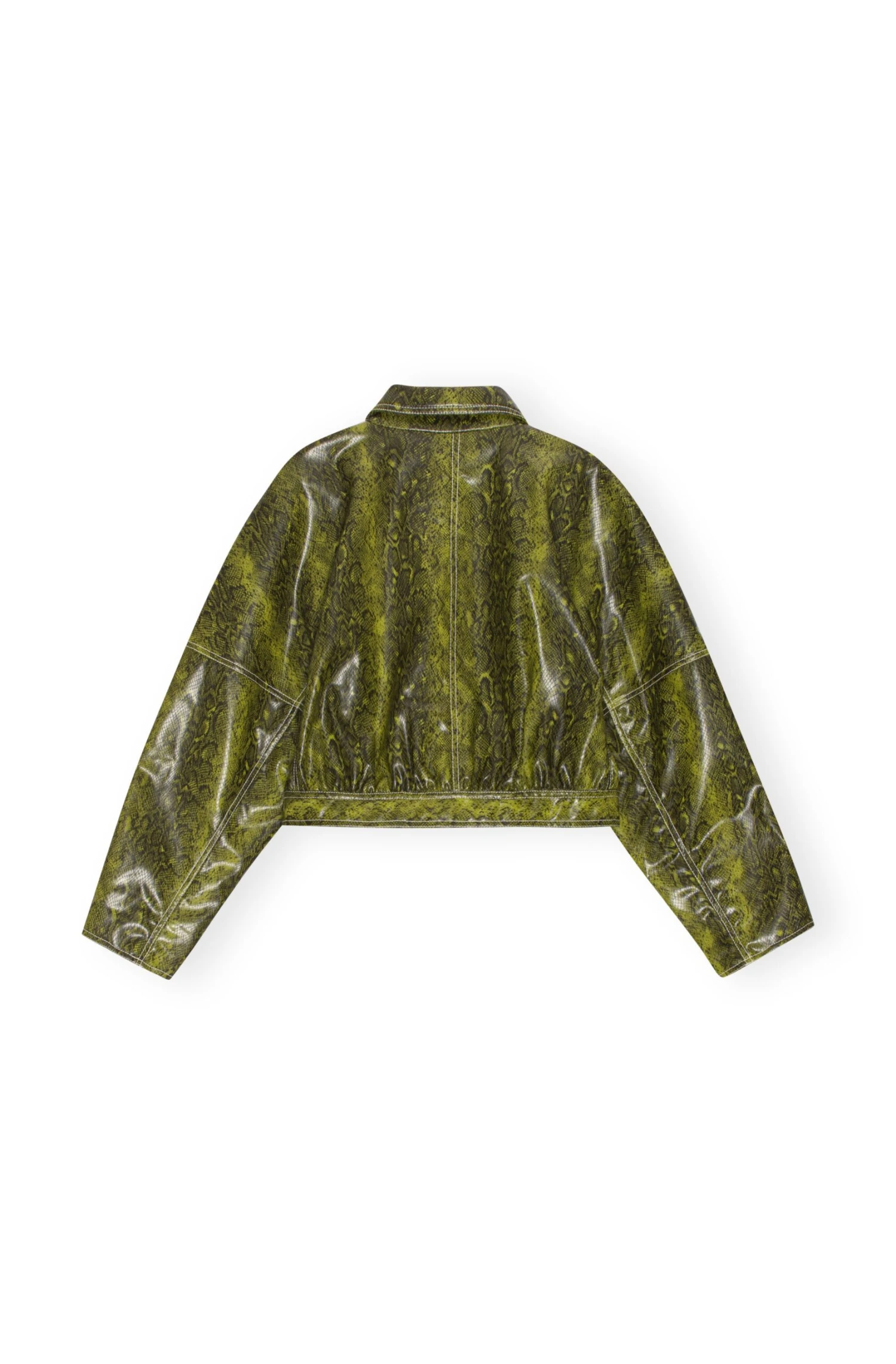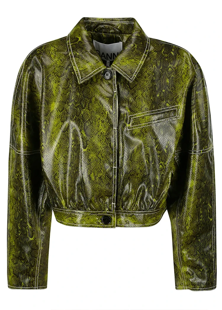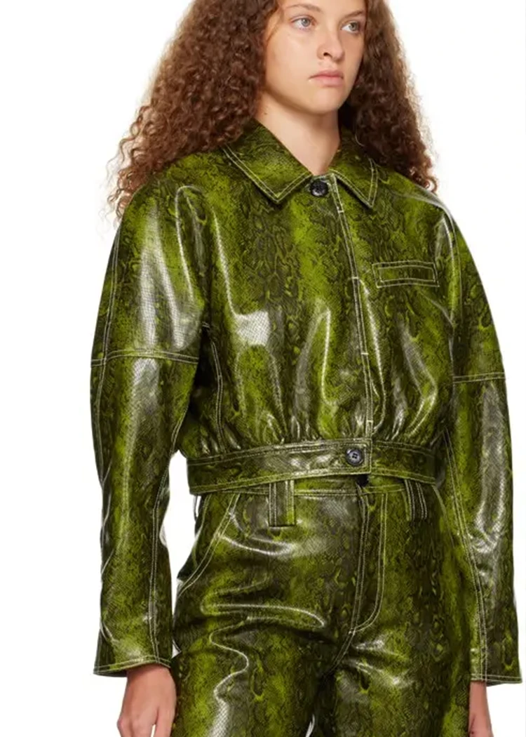 Ganni soft green snake pattern short jacket in a faux recycled leather. Slightly cropped style and subtle sheen.