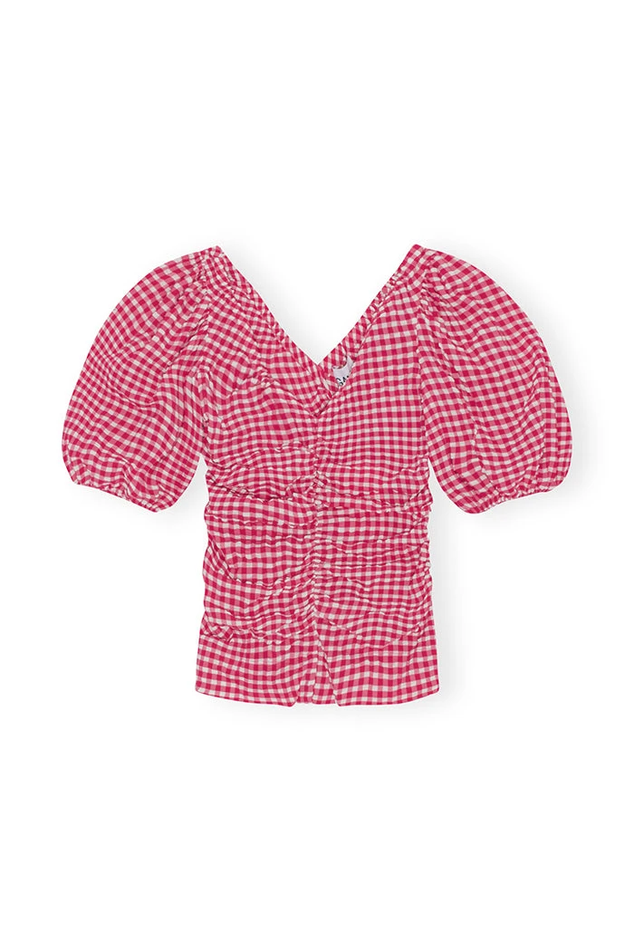 Ganni stretch seersucker gathered v-neck blouse in gingham love potion.
