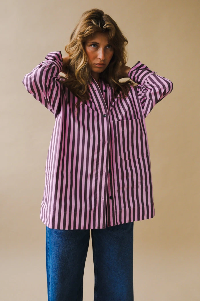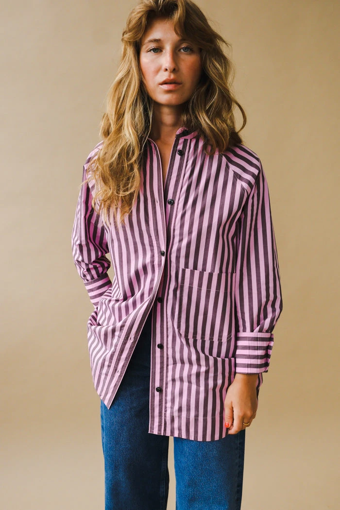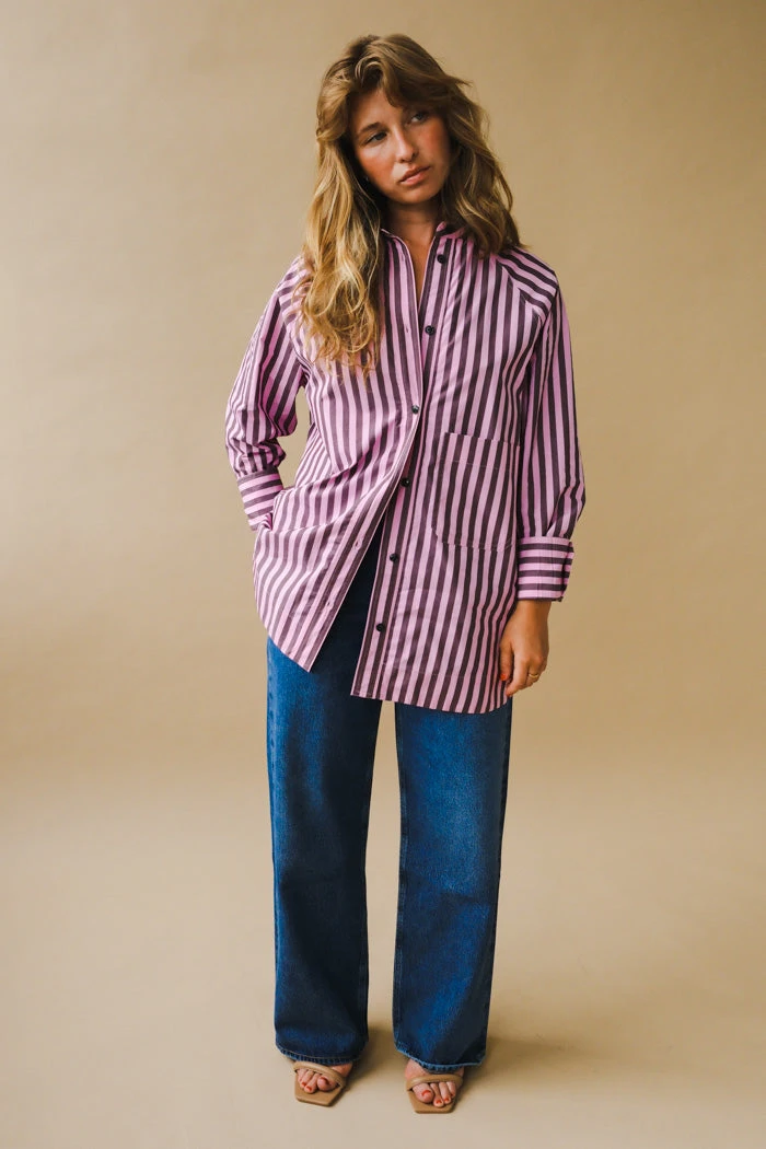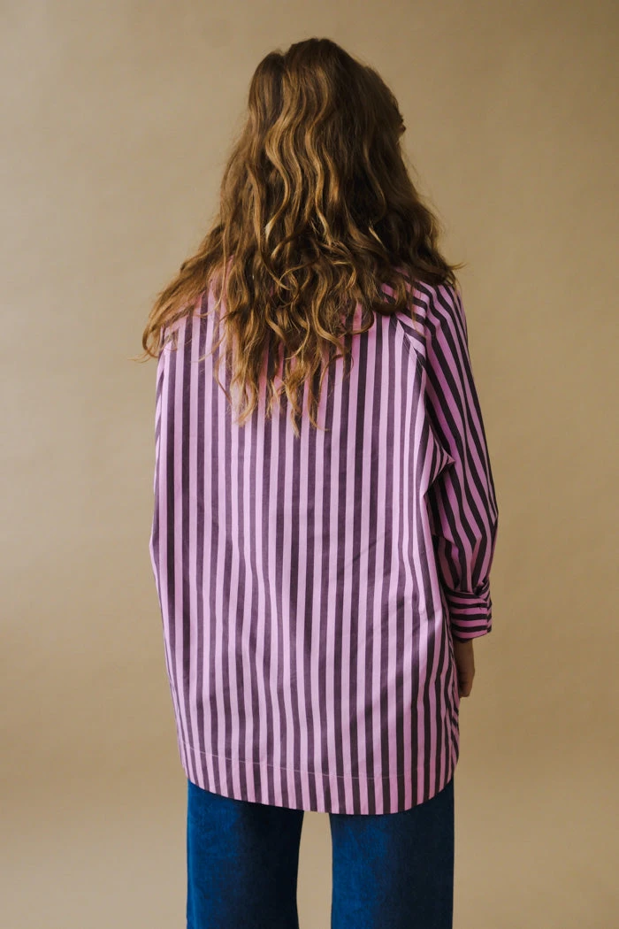Ganni cotton oversized button shirt in dark purple and pink vertical stripes.Â