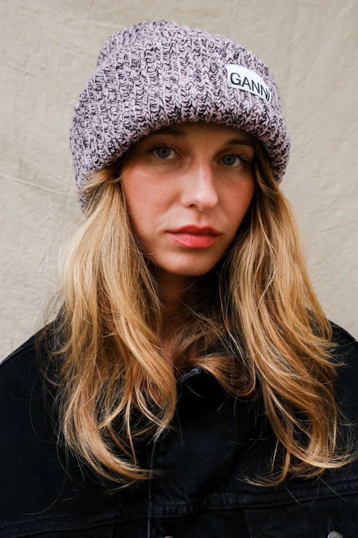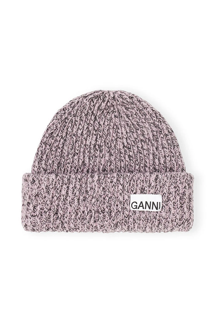 Ganni structured rib beanie in melanged lilac sachet. Features a Ganni logo.