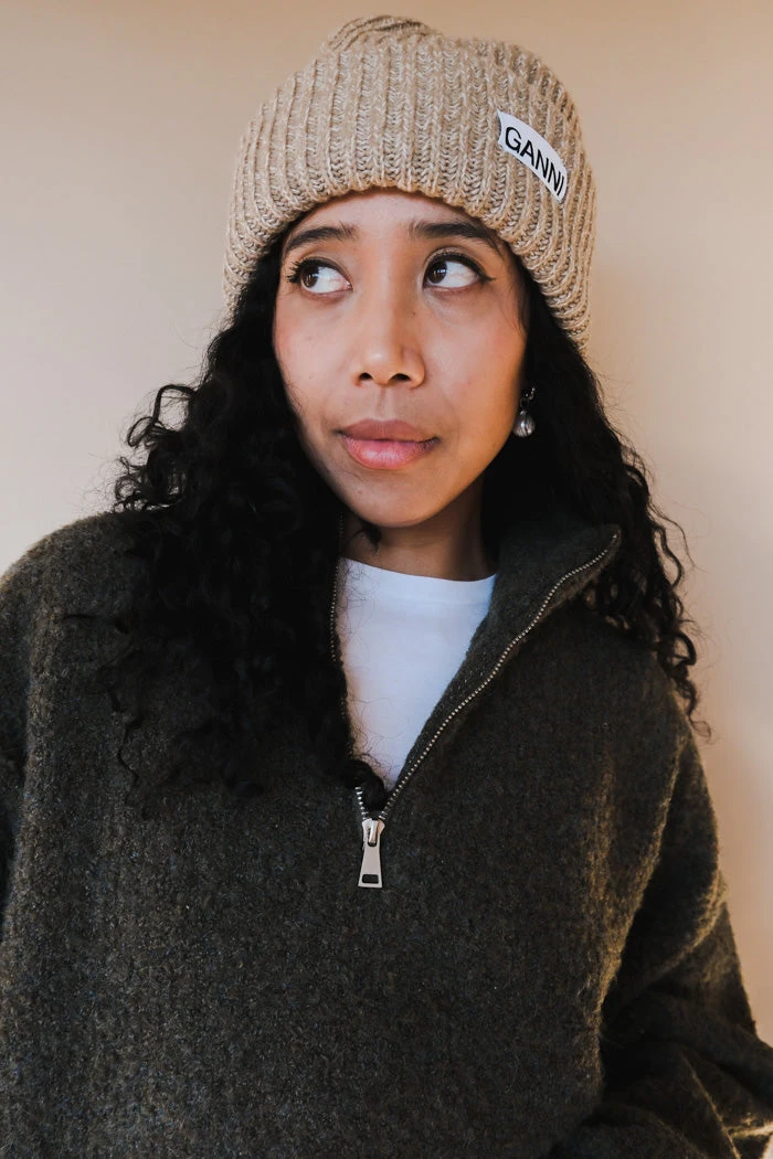 Ganni structured rib beanie in tan petrified oak. Features a Ganni logo.