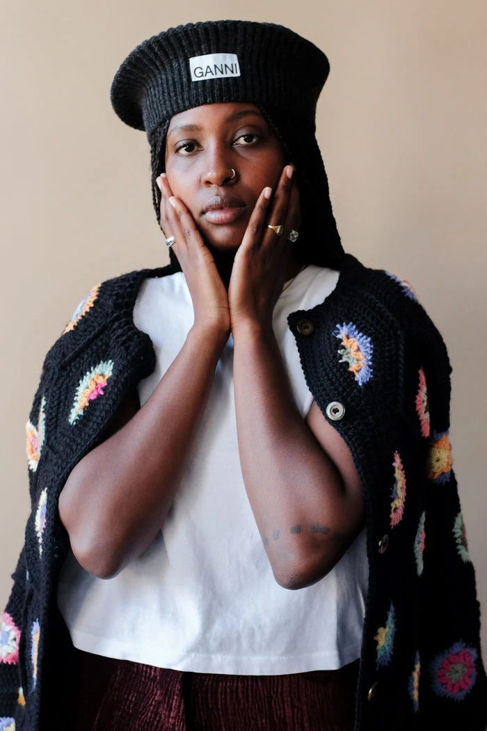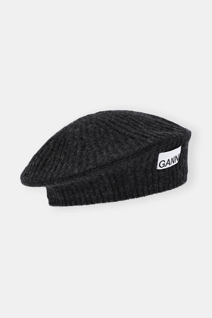 Ganni structured rib beret in phantom charcoal grey with Ganni logo.Â