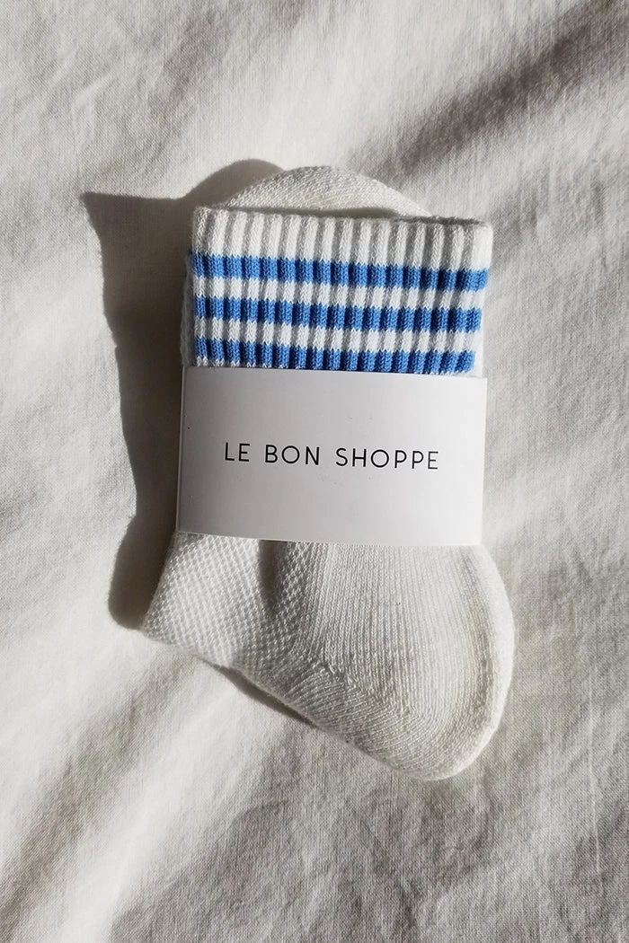 Le Bon Shoppe Girlfriend socks in ivory with baby blue stripes. Crew version of one of our bestselling Boyfriend Socks!