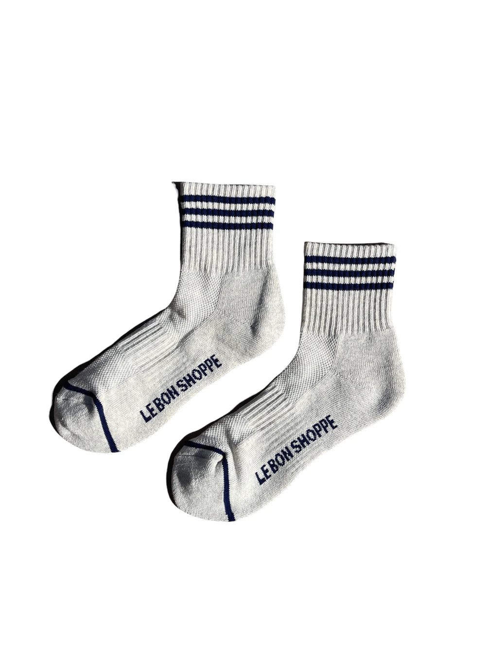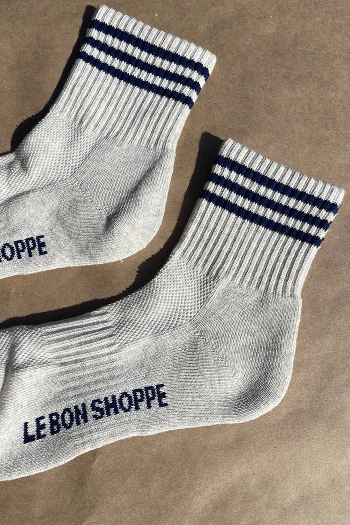 Le Bon Shoppe Girlfriend socks in sailor grey and navy stripe. Crew version of one of our bestselling Boyfriend Socks!